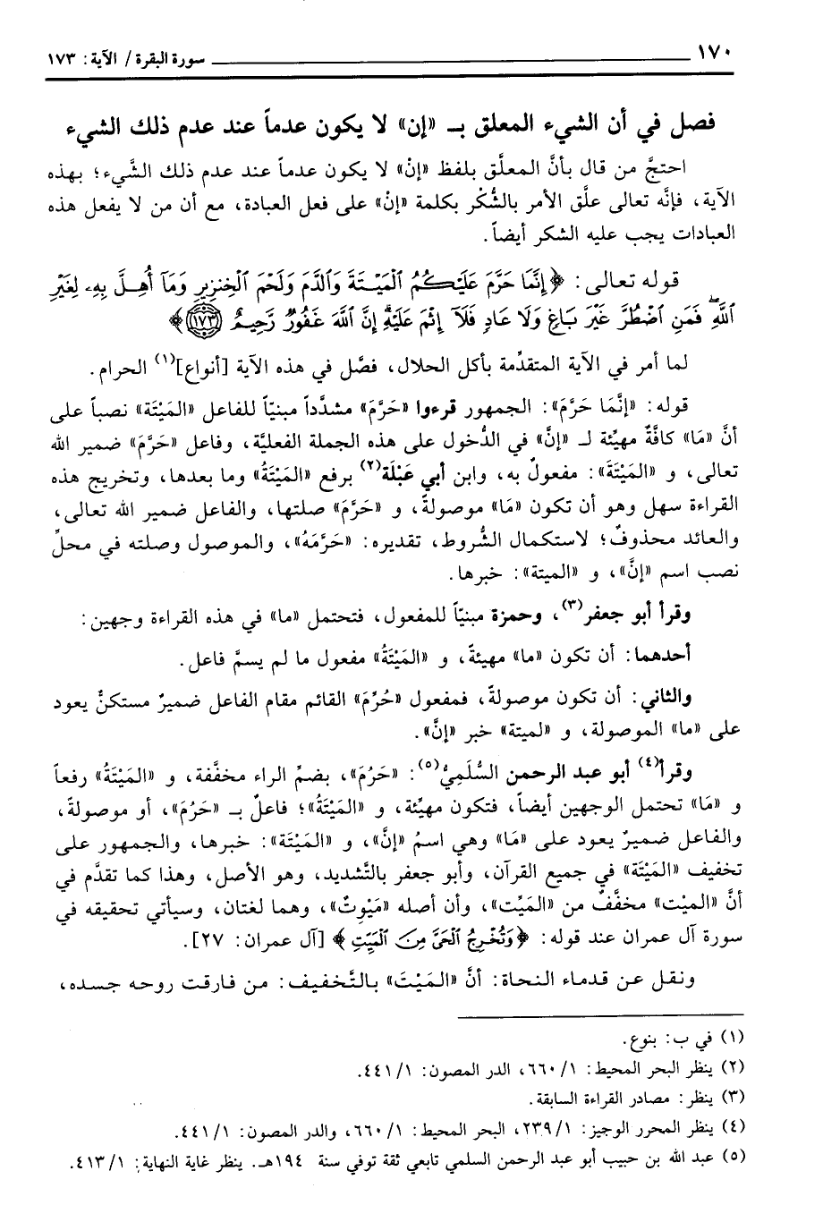 وقرأ أبو عبد الرحمن السُّلَمِيُّ، «حَرُمَ» ، بضمِّ الراء مخفَّفة، و «المَيْتَةُ» رفعاً و «مَّا تحتمل الوجهين أيضاً، فتكون مهيِّئة، و» المَيْتَةُ «؛ فاعلٌ ب» حَرُمَ «، أو موصولةً، والفاعل ضميرٌ يعود على» مَا «وهي اسمُ» إنَّ «، و» المَيْتَة «: خبرها، والجمهور على تخفيف» المَيْتَة «في جميع القرآن، وأبو جعفر بالتَّشديد، وهو الأصل، وهذا كما تقدَّم في أنَّ» الميْت «مخفَّفٌ من» المَيِّت «، وأن أصله» مَيْوتٌ «، وهما لغتان، وسيأتي تحقيقه في سورة آل عمران عند قوله: {وَتُخْرِجُ الحي مِنَ الميت} [آل عمران: 27] .