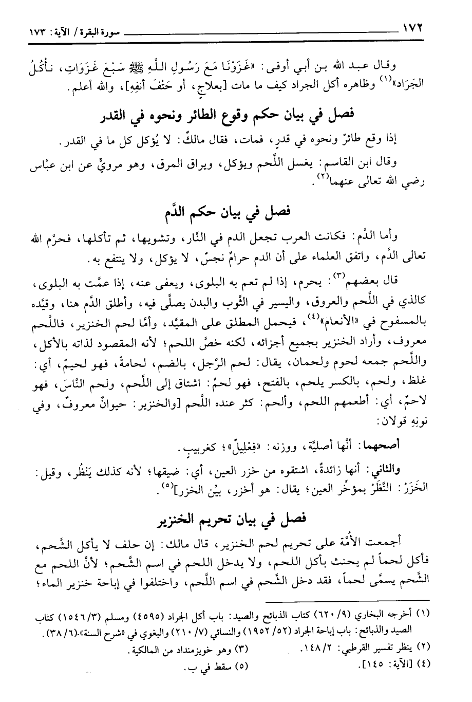 قال بعضهم: يحرمن إذا لم تعم به البلوى، ويعفى عنه، إذا عمَّت به البلوى، كالذي في اللَّحم والعروق، ولايسير في الثَّوب والبدن يصلَّى فيهن وأطلق الدَّم هنا، وقيَّده بالمسفوح في «الأنعام» ، فيحمل المطلق على المقيَّد، وأمَّا لحم الخنزير، فاللَّحم معروف، وأراد الخنزير بجميع أجزائه، لكنه خصَّ اللحم؛ لأنه المقصود لذاته بالأكل، واللَّحم جمعه لحوم ولحمان، يقال: لحم الرَّجل، بالضم، لحامةً، فهو لحيمٌ، أي: غلظ، ولحم، بالكسر يلحم، بالفتح، فهو لحمٌ: اشتاق إلى اللَّحم، ولحم النَّاسَ، فهو لاحمٌ، أي: أطعمهم اللحم، وألحم: كثر عنده اللَّحم [والخنزير: حيوانٌ معروفٌ، وفي نونِهِ قولان: