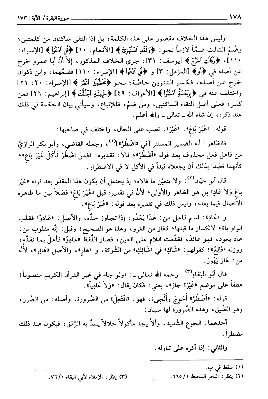قال أبو حيَّان: ولا يتعيَّن ما قالاه؛ إذ يحتمل أن يكون هذا المقدَّر بعد قوله {غَيْرَ بَاغٍ وَلاَ عَادٍ} بل هو الظاهر والأولى؛ لأنَّ في تقديره قبل «غَيْرَ بَاغٍ» فضْلاً بين ما ظاهره الاتصال فيما بعده، وليس ذلك في تقديره بعد قوله: «غَيْرَ بِاغٍ» .