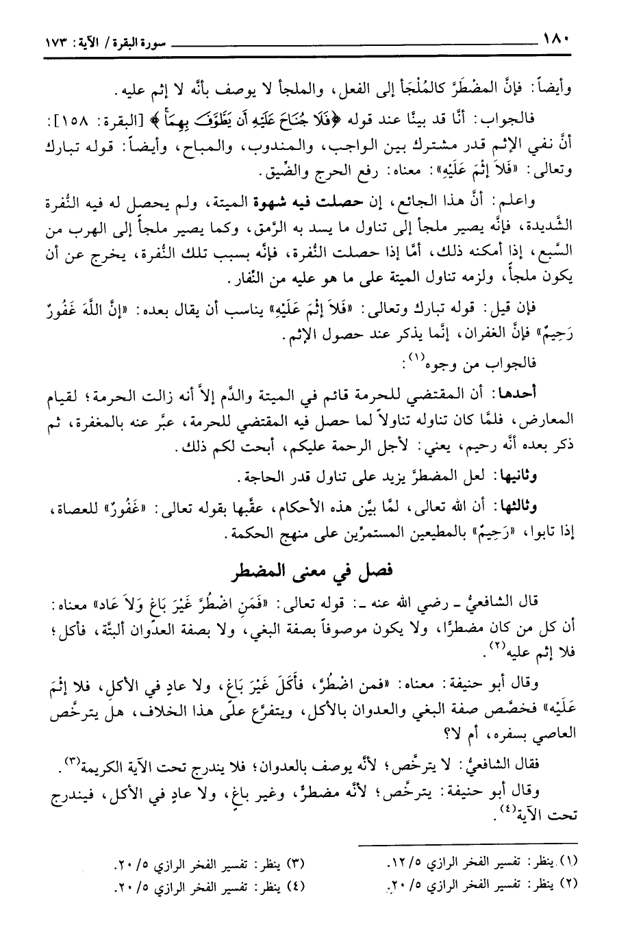 واعلم: أنَّ هذا الجائع، إن حصلت فيه شهوة الميتة، ولم يحصل له فيه النُّفرة الشَّديدة، فإنَّه يصير ملجأ إلى تناول ما يسد به الرَّمق، وكما يصير ملجأً إلى الهرب من السَّبع، إذا أمكنه ذلك، أمَّا إذا حصلت ألنُّفرة، فإنَّه بسبب تلك النُّفرة، يخرج عن أن يكون ملجأً، ولزمه تناول الميتة على ما هو عليه من النِّفار.