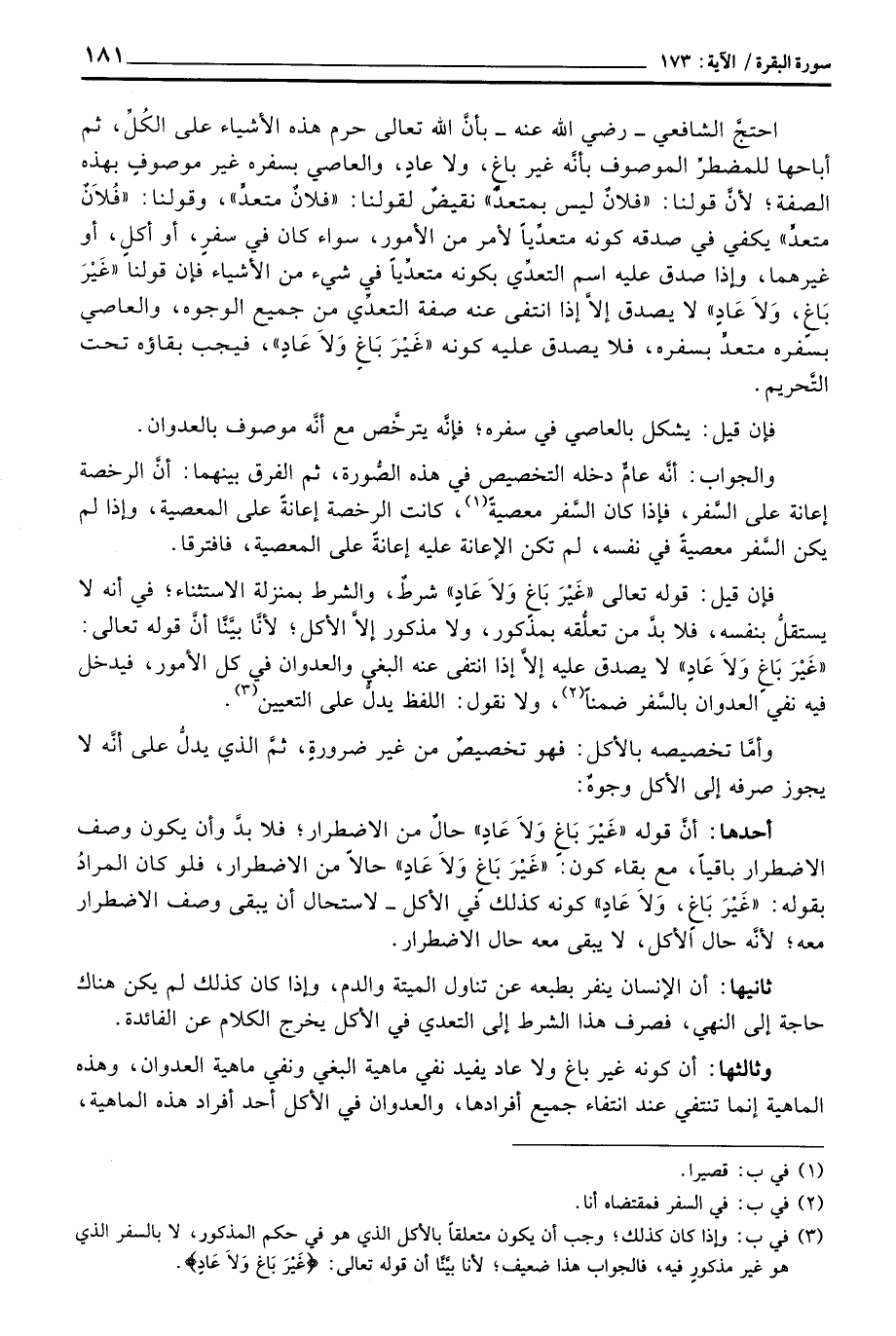 فإن قيل: قوله تعالى «غَيْرَ بَاغٍ وَلاَ عَادٍ» شرطٌ، والشرط بمنزلة الاستثناء؛ في أنه لا يستقلُّ بنفسه، فلا بدَّ من تعلُّقه بمذكورٍ، ولا مذكور إلاَّ الأكل؛ لأنَّ بيَّنَّا أنَّ قوله تعالى: «غَيْرَ بِاغٍ وَلاَ عَادٍ» لا يصدق عليه إلاَّ إذا انتفى عنه البغي والعدوان في كل الأمور، فيدخل فيه نفي العدوان بالسَّفر ضمناً، ولا نقول: اللفظ يدلُّ على التعيين.