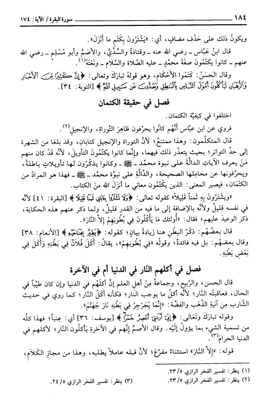 قال المتكلِّمون: وهذا ممتنعٌ؛ لأنَّ التوراة والإنجيل كتابانِ، وقد بلغا من الشهرة إلى حدِّ التواتر؛ بحيث يتعذّر ذلك فيهما، وإِنَّما كانوا يكتُمُونَ التأويلَ، لأنَّه قَدْ كان منهم مَنْ يعرف الآياتِ الدالَّةَ على نبوة محمَّد - صَلَّى الله عَلَيْهِ وَسَلَّم َ - وكانوا يذكُرُون لها تأويلاتٍ باطلةً، ويحرِّفونها عن محامِلها الصحيحة، والدَّالَّةِ على نبوَّة محمَّد - صَلَّى الله عَلَيْهِ وَسَلَّم َ - فهذا هو المرادُ من الكتْمَان، فيصير المعنى: الذين يكْتُمُون معاني ما أنزَلَ الله منَ الكتاب.