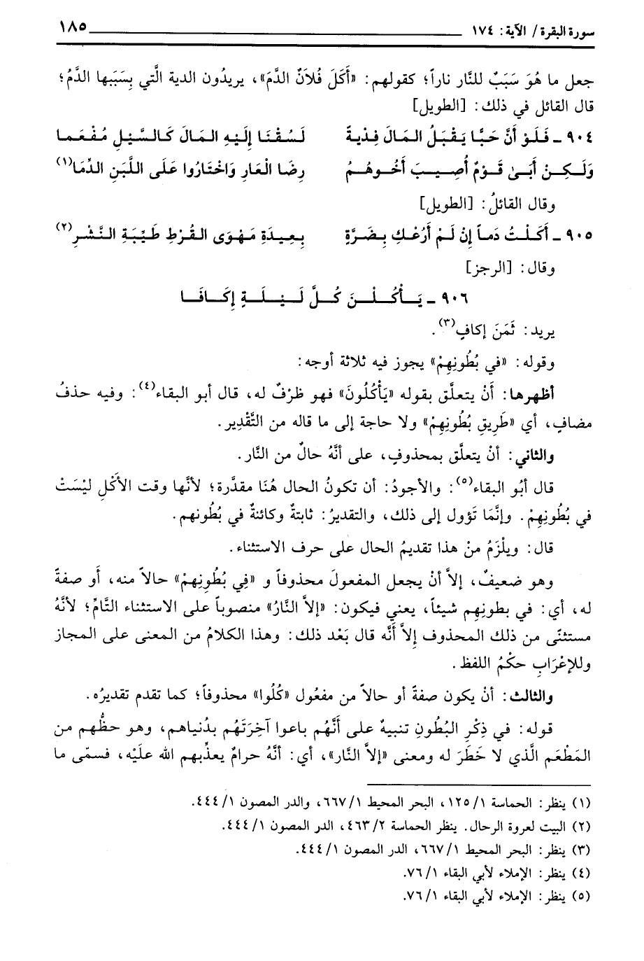 وهو ضعيفٌ، إلاَّ أنْ يجعل المفعولَ محذوفاً و «فِي بُطُونِهِمْ» حالاً منه، أَو صفةً له، أي: في بطونِهِم شيئاً، يعني فيكون: «إلاَّ النَّارُ» منصوباً على الاستثناء التَّامِّ؛ لأنَّهُ مستثنىً من ذلك المحذوف إِلاَّ أَنَّه قال بَعْد ذلك: وهذا الكلامُ من المعنى على المجاز للإعْرَابِ حكْمُ اللفظ.