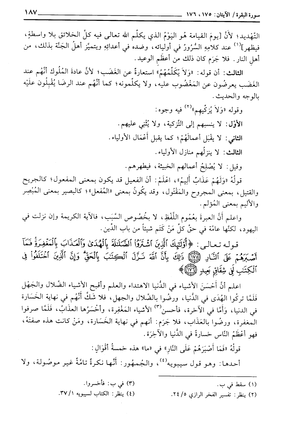 الثالث: أن قوله: «وَلاَ يُكَلِّمُهُمُ» استعارةٌ عن الغَضَب؛ لأنَّ عادةَ المُلُوك أنَّهُم عند الغَضَب يعرضُون عن المَغْضُوب عليه، ولا يكلِّموه؛ كما أنَّهُم عند الرضَا يُقْبِلُون علَيْه بالوجه والحديث.