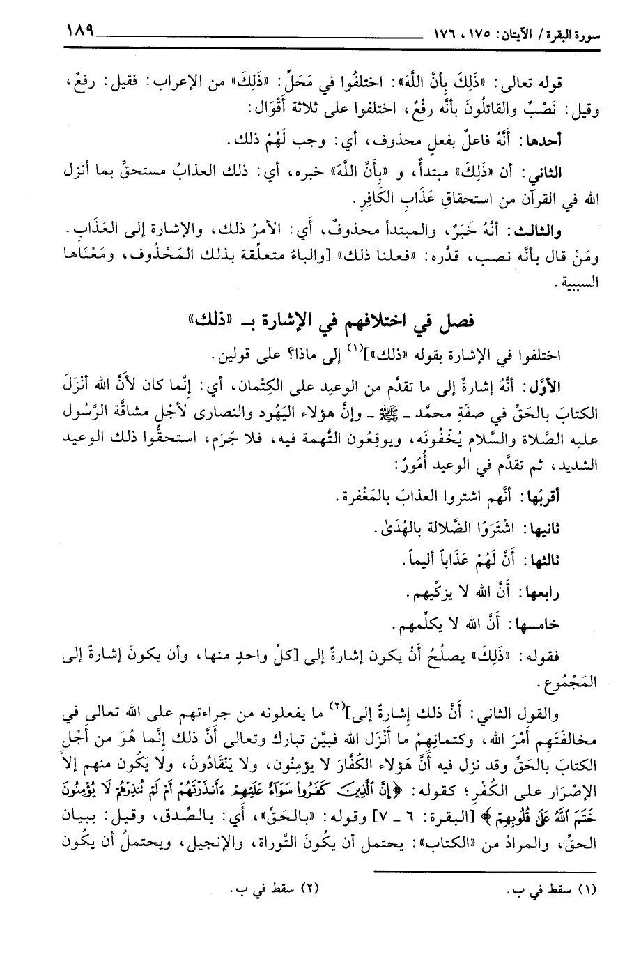 الأوَّل: أنَّهُ إشارةٌ إلى ما تقدَّم من الوعيد على الكِتْمان، أي: إِنَّما كان لأَنَّ الله أنْزَلَ الكتابَ بالحَقِّ في صفَةِ محمَّد - صَلَّى الله عَلَيْهِ وَسَلَّم َ - وإنَّ هؤلاء اليَهُود والنصارى لأجْل مشاقَّة الرَّسُول عليه الصَّلاة والسَّلام يُخْفُونَه، ويوقِعُون التُّهمة فيه، فلا جَرَم، استحقُّو ذلك الوعيد الشديد، ثم تقدَّم في الوعيد أُمُورٌ: