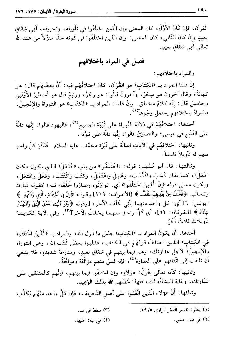 إِنْ قلنا المراد ب «الكَتِابِ» هو القُرْآن، كان اختلافُهُم فيه: أَنَّ بعضَهُ قال: هو كَهَانَةٌ، وقال آخرون هو سِحْرٌ، وآخرونَ قالُوا: هو رجْزٌ، ورابعٌ قال أساطيرُ الأَوَّلين وخامسٌ قال: إِنَّه كلامٌ مختلف. وإنْ قلنا: المراد ب «الكتَابِ» هو التوراةُ والإِنْجيلُ، فالمراد باختلافهم يحتلم وجُوهاً.