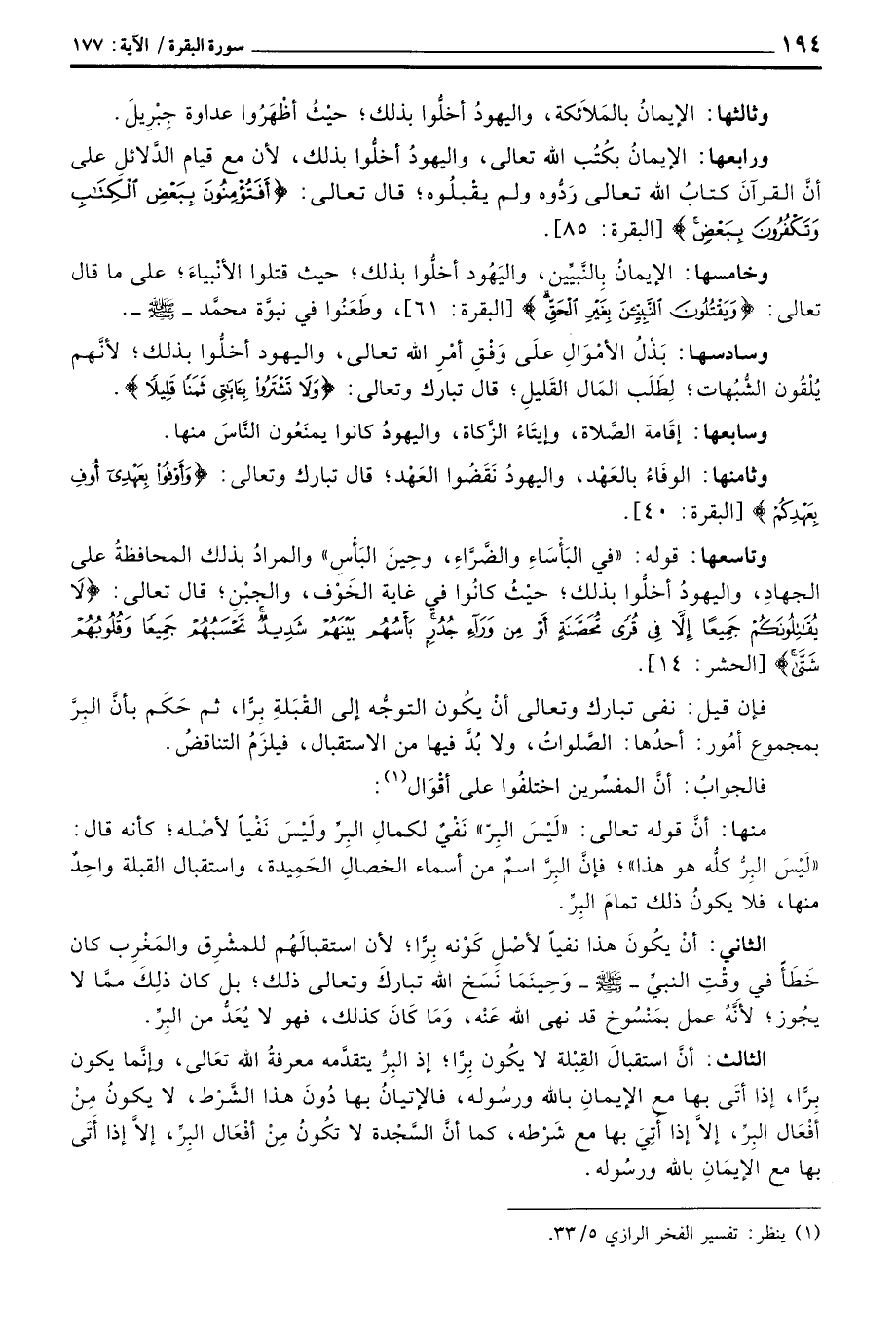 منها: أنَّ قوله تعالى: «لَيْسَ البِرّ» نَفْيٌ لكمالِ البِرِّ ولَيْسَ نَفْياً لأصْله؛ كأنه قال: «لَيْسَ البِرُّ كلُّه هو هذا» ؛ فإنَّ البِرَّ اسمٌ من أسماء الخصالِ الحَمِيدة، واستقبال القبلة واحِدٌ منها، فلا يكونُ ذلك تمامَ البِرِّ.