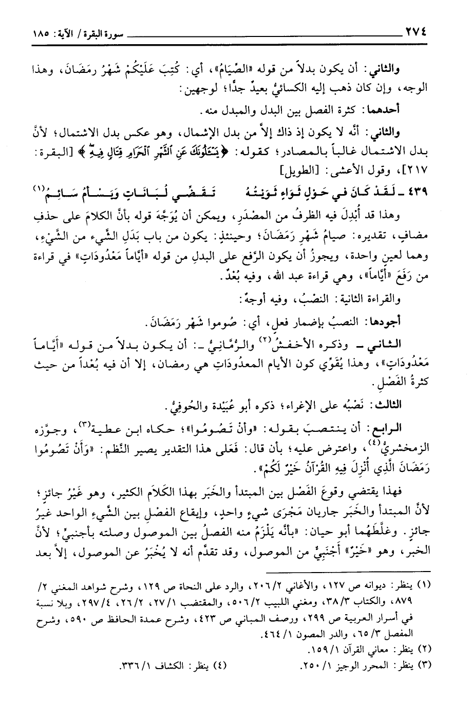 وهذا قد أُبْدِلَ فيه الظرفُ من المصْدَرِ، ويمكن أن يُوَجَّهَ قوله بأنَّ الكلامَ على حذفِ مضافٍ، تقديره: صيامُ شَهْرِ رَمَضَانَ؛ وحينئذٍ: يكون من باب بَدَلِ الشَّيء من الشَّيْءِ، وهما لعين واحدة، ويجوزُ أن يكون الرَّفع على البدلِ من قوله «أَيَّاماً مَعْدُوداتٍ» في قراءة من رَفَعَ «أيَّامً» ، وهي قراءة عبد الله، وفيه بُعْدٌ.