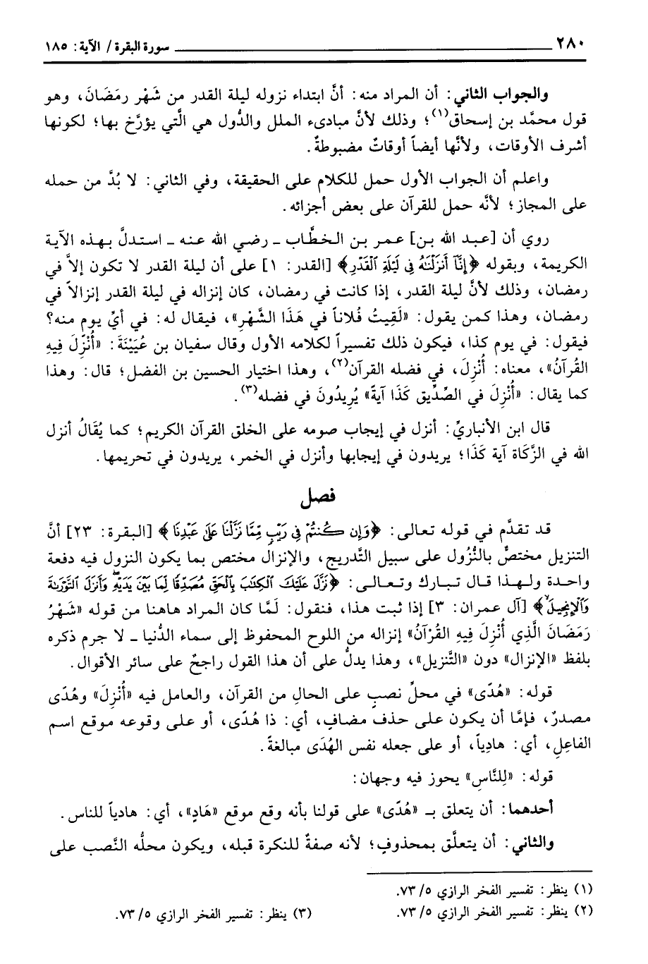 والجواب الثاني: أن المراد منه: أنَّ ابتداء نزوله ليلة القدر من شَهْر رمَضَانَ، وهو قول محمّضد بن إسحاق؛ وذلك لأنَّ مبادئ الملل والدُّول هي الَّتي يؤرَّخ بها؛ لكونها أشرف الأوقات، ولأنَّها أيضاً أوقاتٌ مضبوطةٌ.