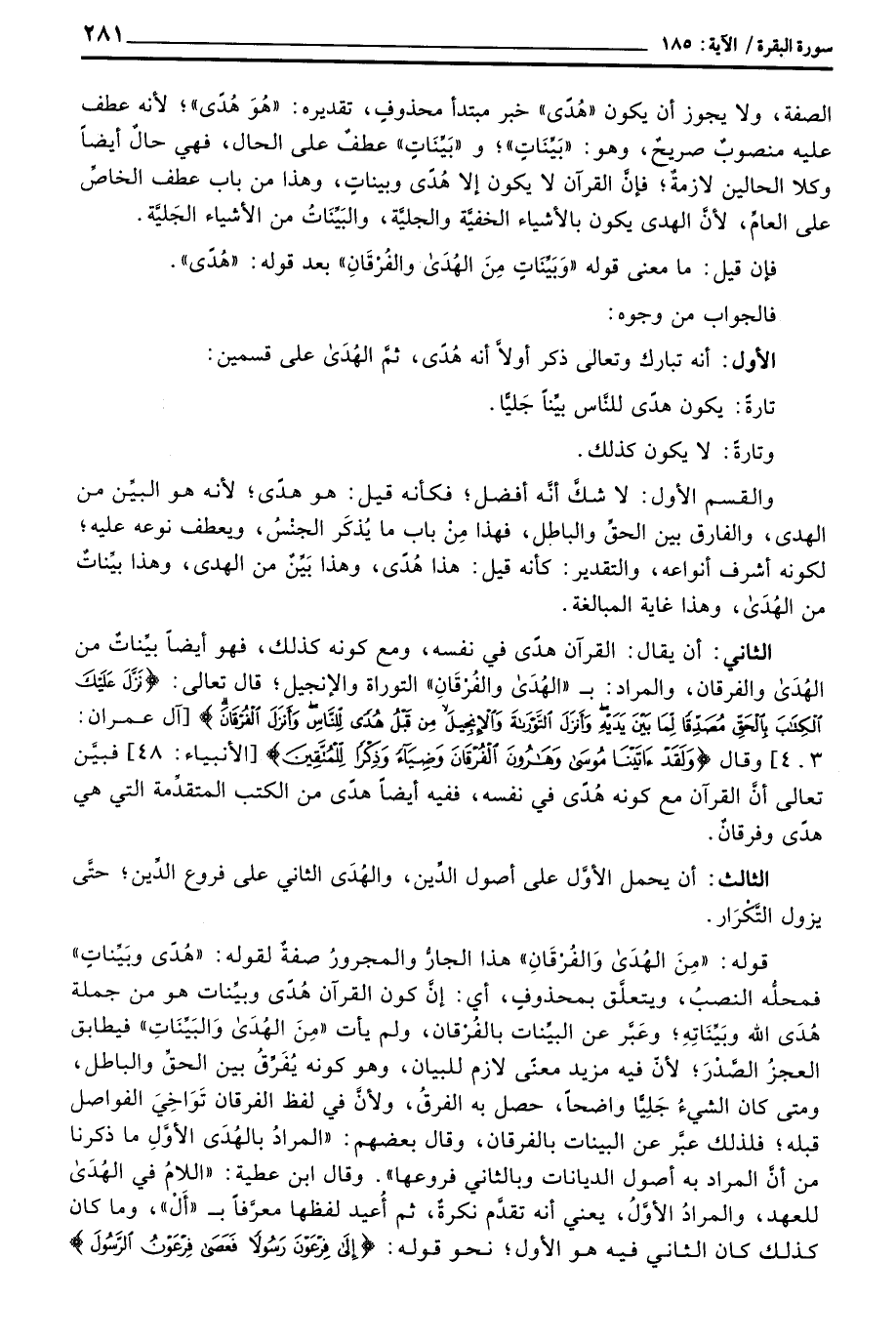 والقسم الأول: لا شكَّ أنَّه أفضل؛ فكأنه قيل: هو هدىً؛ لأنه هو البيِّن من الهدى، والفارق بين الحقِّ والباطل، فهذا مِنْ باب ما يُذكَر الجنْسُ، ويعطف نوعه عليه؛ لكونه أشرف أنواعه، والتقدير: كأنه قيل: هذا هُدىً، وهذا بَيِّنٌ من الهدى، وهذا بيِّناتٌ من الهُدَى، وهذا غاية المبالغة.