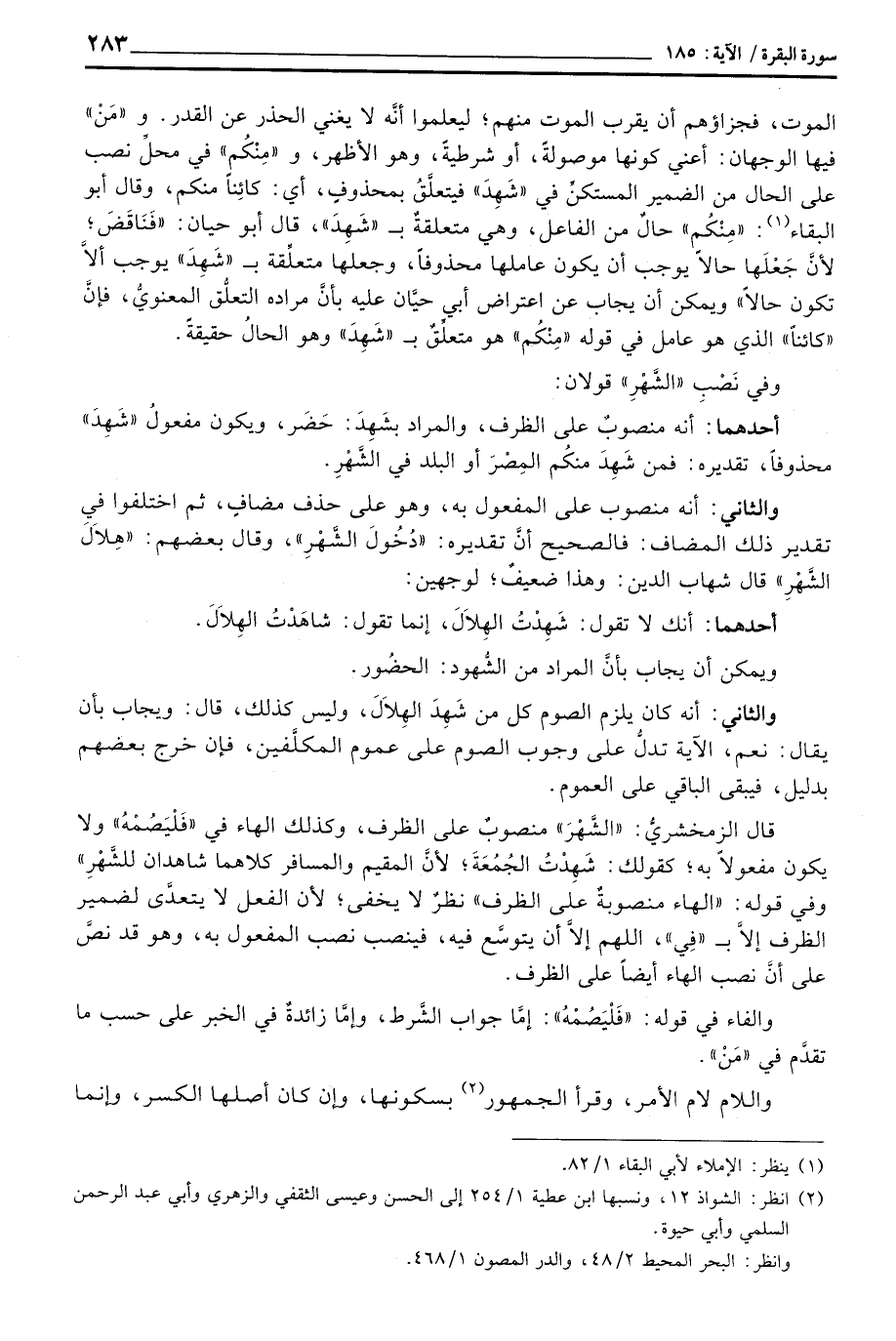 والثاني: أنه منصوب على المفعول به، وهو على حذف مضافٍ، ثم اختلفوا في تقدير ذلك المضاف: فالصحيح أنَّ تقديره:» دُخُولَ الشَّهْرِ «، وقال بعضهم:» هِلاَلَ الشَّهْرِ «قال شهاب الدين: وهذا ضعيفٌ؛ لوجهين: