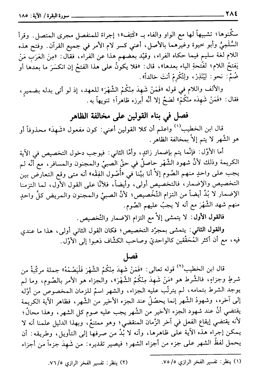 قال ابن الخطيب قوله تعالى {فَمَنْ شَهِدَ مِنْكُمْ الشَّهْرَ فَلْيَصُمْهُ} جملة مركِّبةٌ من شرطٍ وجزاءٍ، فالشَّرط هو {مَنْ شَهِدَ مِنْكُمُ الشَّهْرَ} ، والجوءا هو الأمر بالصَّوم وما لم يوجد الشرط بتمامه، لم يترتَّب عليه الجزاء، والشهر اسمٌ للزمان المخصوص من أوَّله إلى آخره، وشهودُ الشَّهر إنما يحصُلُ عند الجزء الأخير من الشَّهر، فظاهر الآية الكريمة يقتضي أنَّ عند شهود الجزء الأخير من الشَّهر يجب عليه صوم كل الشهر، وهذا محالٌ، لأنه يقتضي إيقاع الفعل في آخر الزَّمان المنقضي؛ وهو ممتنعٌ، وبهذا الدليل علمنا أنه لا يمكن إجراء هذه الآية على ظاهرها، وأنه لا بُدَّ من صرفها إلى التأويل، وطيرقه: أن يحمل لفظُ الشهر على جزء من أجزاء الشهر؛ فيصير تقديره: من شَهِدَ جزءاً من أجزاء