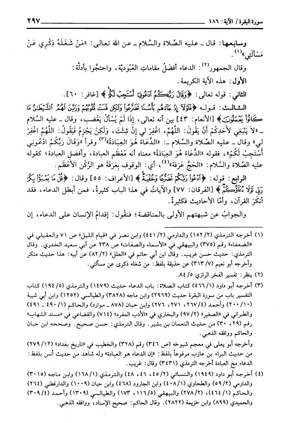 الرابع: قوله: {ادعوا رَبَّكُمْ تَضَرُّعاً وَخُفْيَةً} [الأعراف: 55] وقال: {قُلْ مَا يَعْبَأُ بِكُمْ رَبِّي لَوْلاَ دُعَآؤُكُمْ} [الفرقان: 77] والآياتُ في هذا الباب كثيرةٌ، فمن أبطل الدعاء، فقد أنكَرَ القرآن، وأمَّا الأحاديث فكثيرةٌ.