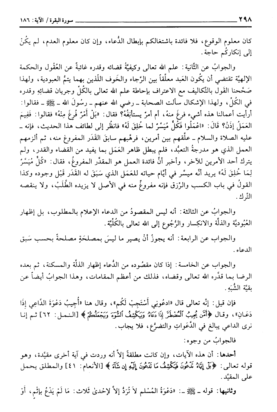 والجواب عن الخامس: إذا كان مقصُوده من الدُّعاء إظهار الذلَّة والمسكنة، ثم بعده الرضا بما قدَّره الله تعالى وقاضه، فذلك من أعظم المقامات، وهذا الجوابُ أيضاً بقيَّة الشُّبَهِ.