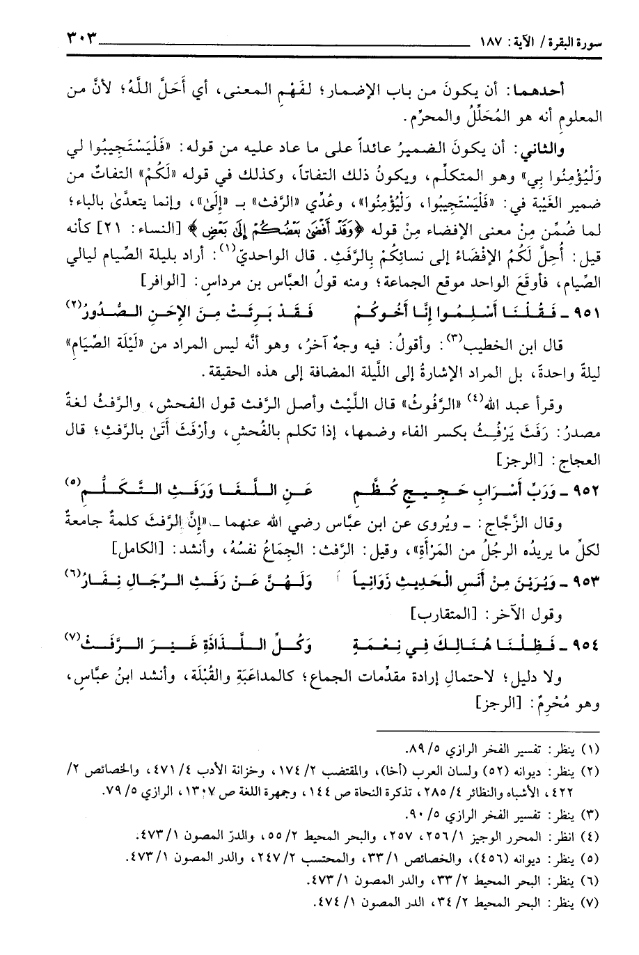 والثاني: أن يكونَ الضميرُ عائداً على ما عاد عليه من قوله: {فَلْيَسْتَجِيبُواْ لِي وَلْيُؤْمِنُواْ بِي} وهو المتكلِّم، ويكونُ ذلك التفاتاً، وكذلك في قوله: «لَكُمْ» التفاتٌ من ضمير الغَيْبة في: «فَلْيَسْتَجِيبُوا، وَلْيُؤْمِنُوا» ، وعُدِّي «الرَّفث» ب «إِلَى» ، وإنما يتعدَّى بالباء؛ لما ضُمِّن مِنْ معنى الإفضاء مِنْ قوله {وَقَدْ أفضى بَعْضُكُمْ إلى بَعْضٍ} [النساء: 21] كأنه قيل: أُحِلَّ لَكُمْ الإفْضَاءُ إلى نسائِكُمْ بِالرَّفَثِ. قال الواحديّ: أراد بليلة الصِّيام ليالي الصِّيام، فأوقَعَ الواحد موقع الجماعة؛ ومنه قولُ العبَّاس بن مرداسٍ: [الوافر]