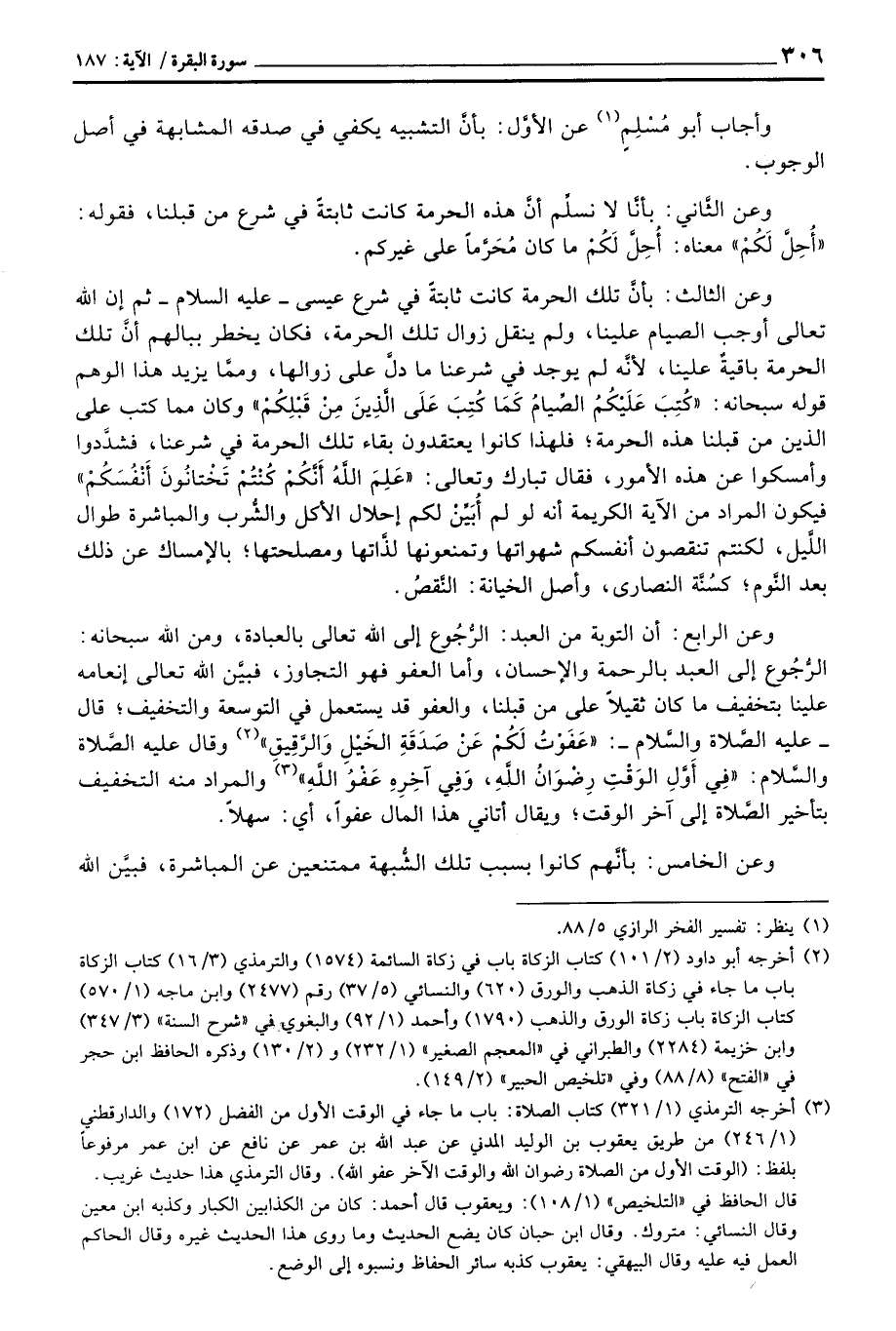 وعن الثَّاني: بأنَّا لا نسلِّم أنَّ هذه الحرمة كانت ثابتةً في شرع من قبلنا، فقوله: «أُحِلَّ لَكُمْ» معناه: أُحِلَّ لَكُمْ ما كان مُحَرَّماً على غيركم.