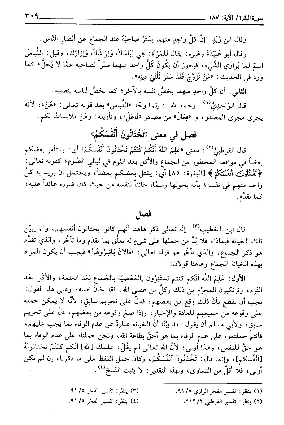 قال ابن الخطيب: إنَّه تعالى ذكر هاهنا أنَّهم كانوا يختانون أنفسهم، ولم يبيِّن تلك الخيانة فيماذا، فلا بُدَّ من حملها على شيءٍ له تعلُّق بما تقدَّم وما تأخَّر، والذي تقدَّم هو ذكر الجماع، والذي تأخَّر هو قوله تعالى: «فَالآنَ بَاشِرُوهُنَّ» فيجب أن يكون المراد بهذه الخيانة الجماع وهاهنا قولان: