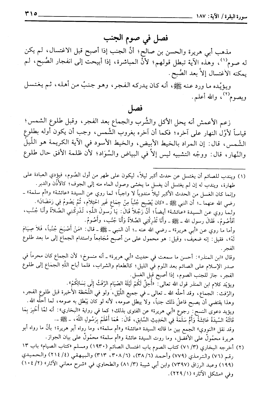 مذهب أبي هريرة والحسن بن صالح؛ أنَّ الجنب إذا أصبح قبل الاغتسال، لم يكن له صوم، وهذه الآية تبطل قولهم؛ لأنَّ المباشرة، إذا أبيحت إلى انفجار الصُّبح، لم يمكنه الاغتسال إلاَّ بعد الصُّبح.