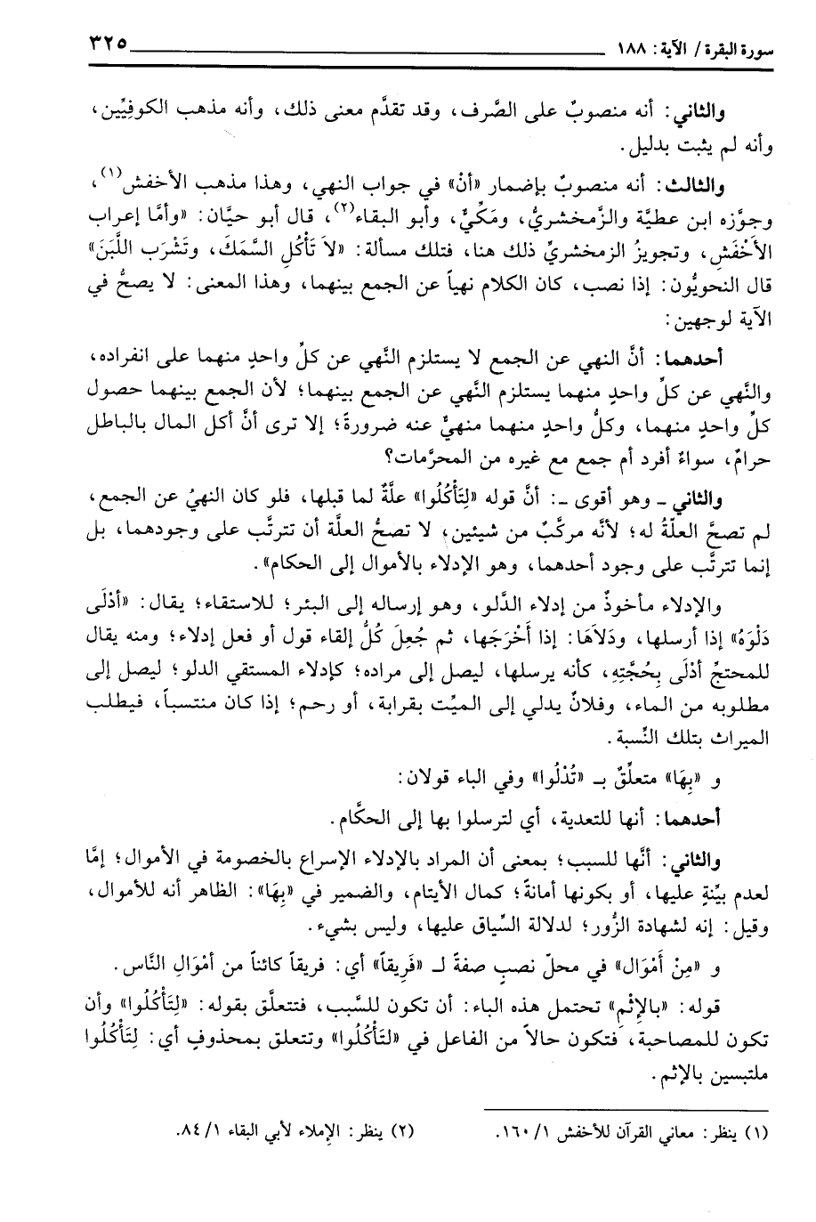 والثاني - وهو أقوى -: أنَّ قوله» لِتَأْكُلُوا «علَّةٌ لما قبلها، فلو كان النهيُ عن الجمع، لم تيصحَّ العلّةُ له؛ لأنَّه مركَّبٌ من شيئين، لا تصحُّ العلَّة أن تترتَّب على وجودهما، بل إنما تترتَّب على وجود أحدهما: وهو الإدلالء بالأموال إلى الحكام» .