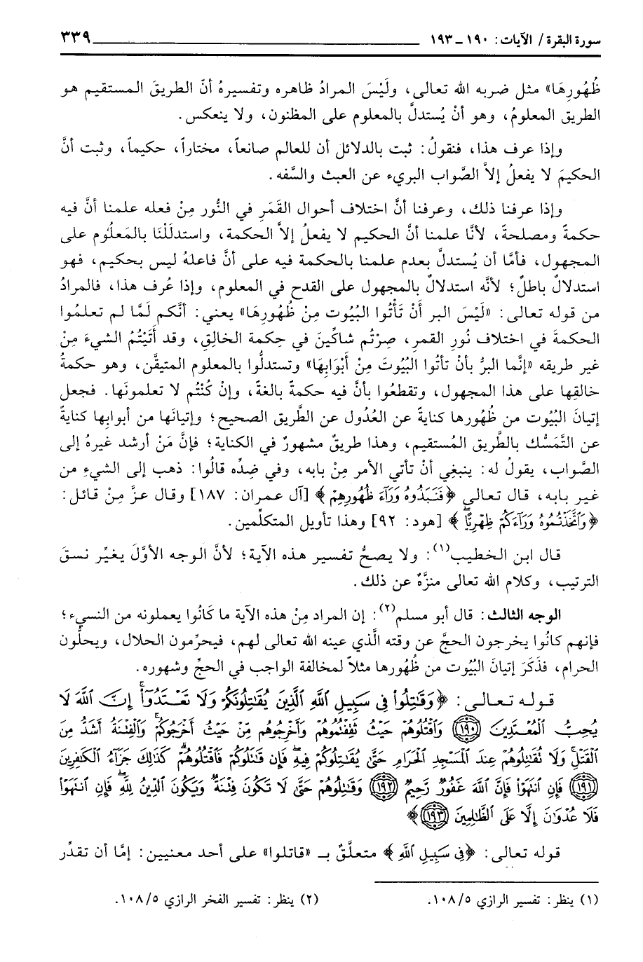 وإذا عرفنا ذلك، وعرفنا أنَّ اختلاف أحوال القَمَر في النُّور مِنْ فعله علمنا أنَّ فيه حكمةً ومصلحةً، لأنَّا علمنا أنَّ الحكيم لا يفعلُ إلاَّ الحكمة، واستدلَّلْنَا بالمَعلُوم على المجهول، فأمَّا أن يُستدلَّ بعدم علمنا بالحكمة فيه على أنَّ فاعلهُ ليس بحكيم، فهو استدلالٌ باطلٌ؛ لأنَّه استدلالٌ بِالمجهول على القدح في المعلوم، وإذا عُرف هذا، فالمرادُ من قوله تعالى: {لَيْسَ البر بِأَن تَأْتُواْ البيوت مِن ظُهُورِهَا} يعني: أنَّكم لَمَّا لم تعلمُوا الحكمةَ في اختلاف نُورِ القمرِ، صِرْتُم شاكِّينَ في حِكمة الخالِقِ، وقدأَتَيْتُمُ الشيءَ مِنْ غير طريقه «إنَّما البرُّ بأنْ تأتُوا البُيُوتَ مِنْ أَبْوَابِهَا» وتستدلُّوا بالمعلوم المتيقَّن، لا تعلمونَها، فجعل إتيانَ البُيُوت من ظُهُورها كنايةً عن العُدُول عن الطَّريق الصحيح؛ وإتيانَها من أبوابِها كنايةً عن التَّمَسُّك بالطَّريق المُستقيم، وهذا طريقٌ مشهورٌ في الكناية؛ فإنَّ مَنْ أرشد غيرهُ إلى الصَّواب، يقولُ له: ينبغِي أنْ تأتي الأمر مِنْ بابه، وفي ضِدَّه قالُوا: ذهبإل لاشيءِ من غير بابه، قال تعالى: {فَنَبَذُوهُ وَرَآءَ ظُهُورِهِمْ} [آل عمراان: 187] وقال عزَّ مِنْ قَائل: {واتخذتموه وَرَآءَكُمْ ظِهْرِيّاً} [هود: 92] وهذا تأويل المتكلِّمين.