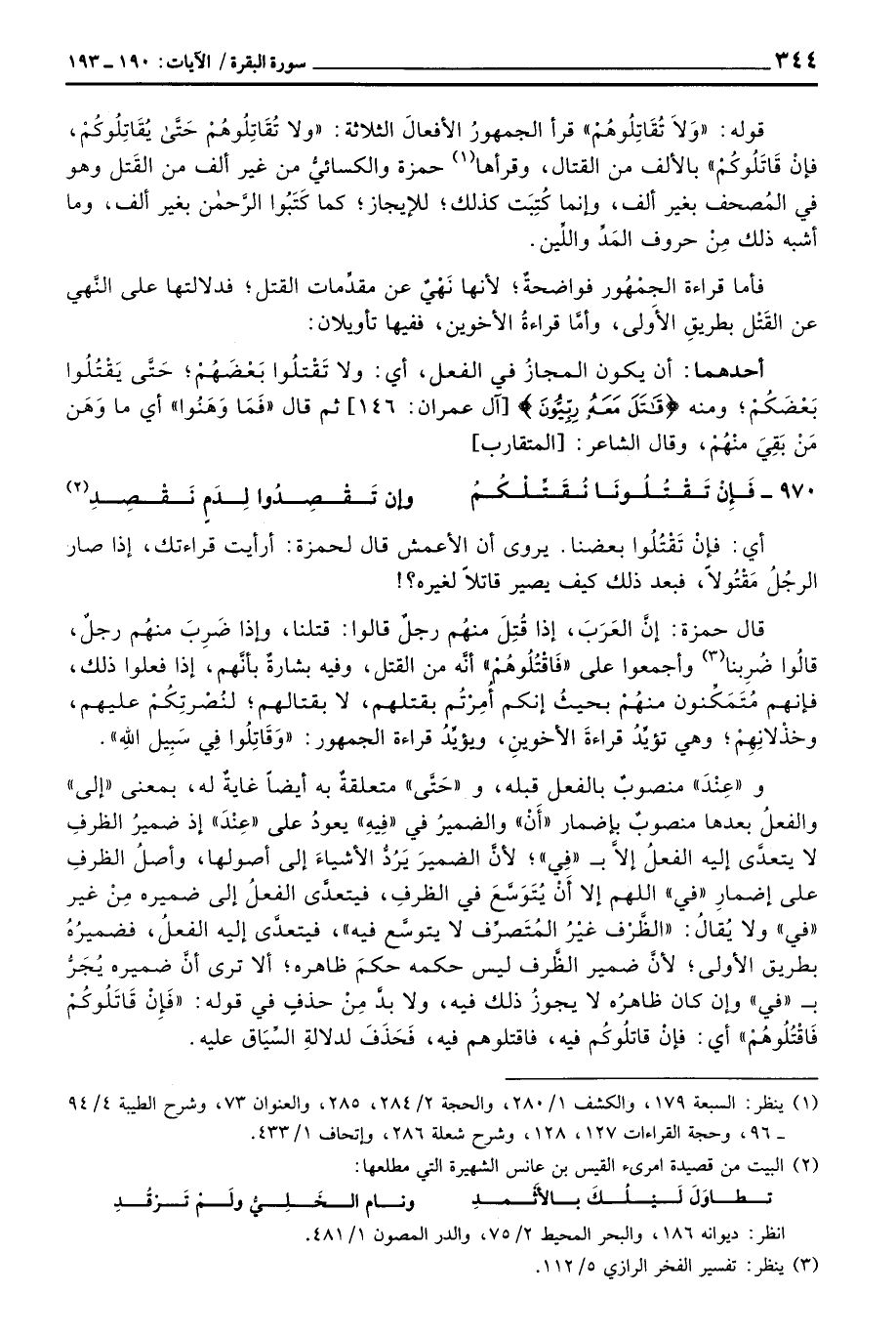 قوله: «وَلاَ تُقَاتِلُوهُمْ» قرأ الجمهورُ الأفعالَ الثلاثة: «ولا تُقَاتِلُوهُمْ حَتَّى يُقَاتِلُوكُمْ، فإنْ قَاتَلُوكُمْ» بالألف من القتال، وقرأها حمزة، والكسائيُّ من غير ألف من القَتل وهو المُصحف بغير ألف، وإنما كُتِبَت كذلك؛ للإيجاز؛ كما كَتَبُوا الرَّحمن بغير ألف، وما أشبه ذلك مِنْ حروف المَدِّ واللِّين.