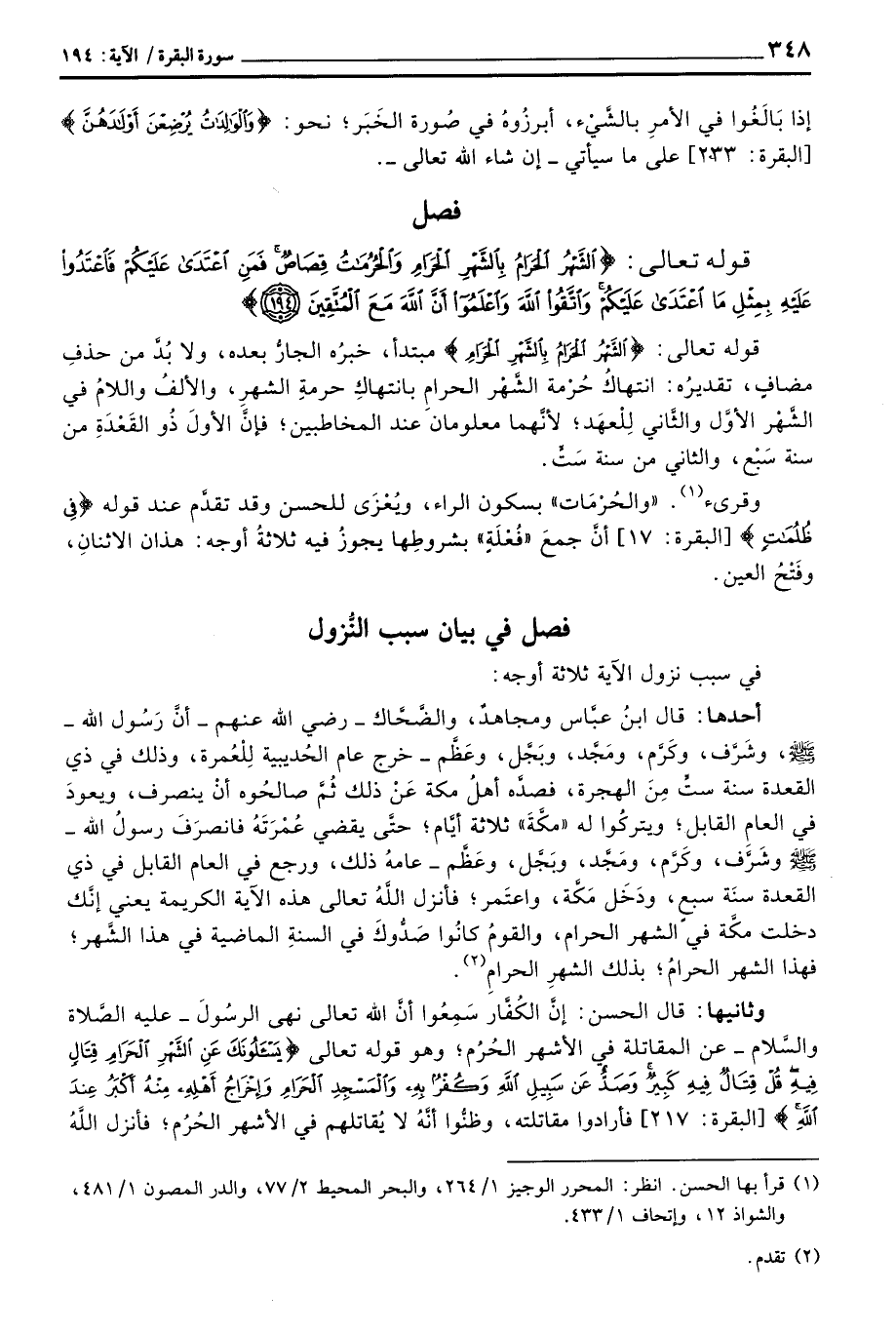 أحدها: قال ابنُ عبَّاس ومجاهدٌ، والضَّحَّاك - رَضِيَ اللَّهُ عَنْهم - أنَّ رَسُول الله - صَلَّى اللَّهُ عَلَيْهِ وَسَلَّم َ، وشَرَّف، وكَرَّم، ومَجَّد، وبَجَّل، وعَظَّم - خرج عام الحُديبية لِلْعُمرة، وذلك في ذي القعدة سنة ستٍّ مِنَ الهجرة، فصدَّه أهلُ مكة عَنْ ذلك ثُمَّ صالحُوه أنْ ينصرف، ويعودَ في العام القابل؛ ويتركُوا له «مكَّةَ» ثلاثة أيَّام؛ حتَّى يقضي عُمْرَتَهُ فانصرَفَ رسولُ الله - صَلَّى اللَّهُ عَلَيْهِ وَسَلَّم َ وشَرَّف، وكَرَّم، ومَجَّد، وبَجَّل، وعَظَّم - عامهُ ذلك، ورجع في العام القابل في ذي القعدة سنَة سبعٍ، ودَخَل مَكَّة، واعتَمر؛ فأنزل اللَّهُ تعالى هذه الآية الكريمة يعني إنَّك دخلت مكَّة في الشهر الحرام، والقومُ كانُوا صَدُّوكَ في السنةِ الماضية في هذا الشَّهر؛ فهذا الشهر الحرامُ؛ بذلك الشهرِ الحرامِ.