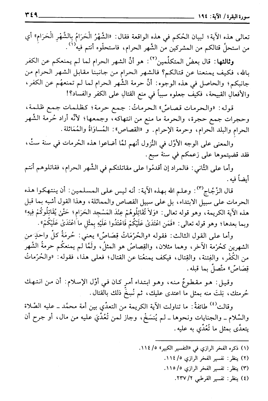 قال الزَّجَاج: وعلم الله بهذه الآية: أنه ليس على المسلمين: أن ينتهكوا هذه الحرمات على سبيل الابتداء، بل على سبيل القصاص والمماثلة، وهذا القول أشبه بما قبل هذه الآية الكريمة، وهو قوله تعالى: {وَلاَ تُقَاتِلُوهُمْ عِنْدَ المسجد الحرام حتى يُقَاتِلُوكُمْ فِيهِ} [البقرة: 191] وبما بعدها؛ وهو قوله تعالى: {فَمَنِ اعتدى عَلَيْكُمْ} .