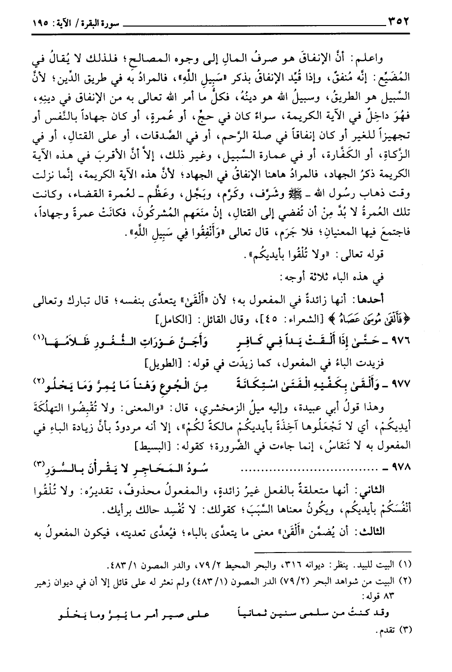 وهذا قولُ أبي عبيدة، وإليه ميلُ الزمخشري، قال: «والمعنى: ولا تُقْبِضُوا التهلُكَةَ أيدِيكُمْ، أي لا تَجْعَلُوها آخِذَةً بأيديكُمْ مالكةً لكُمْ» ، إلا أنه مردودٌ بأنَّ زيادة الباء في المفعول به لا تَنقاسُ، إنما جاءت في الضَّرورة؛ كقوله: [البسيط]