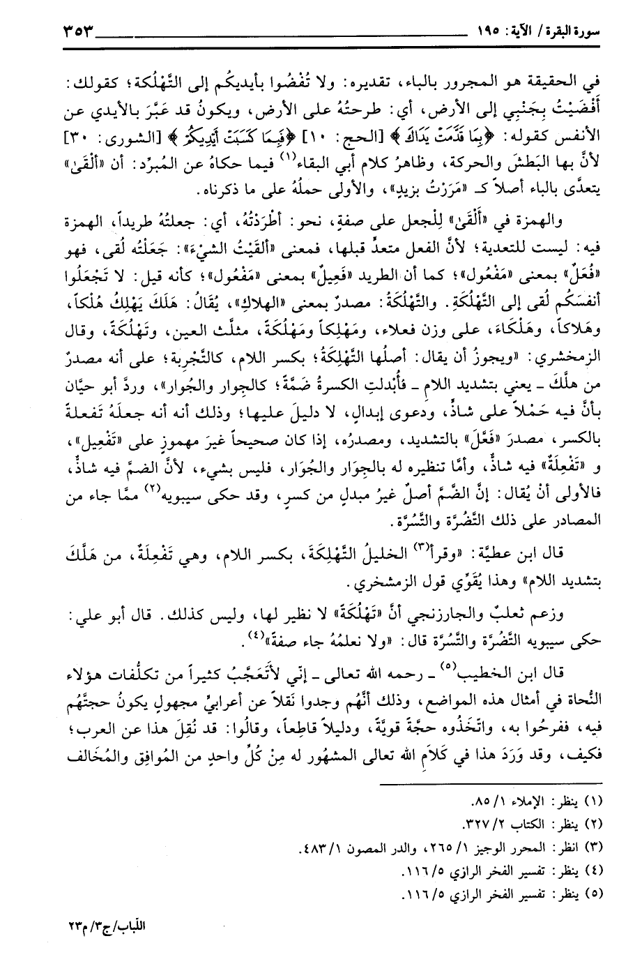 وزعم ثعلبٌ والجارزنجي أنَّ» تَهْلُكَةً «لا نظير لها، وليس كثيراً من تكلُّفات هؤلاء النُّحاة في أمثال هذه المواضع، وذلك أنَّهُم وجدوا نَقلاً عن أعرابيٍّ مجهولٍ يكونُ حجتَّهُم فيه، ففرحثوا به، واتّخَذُوه حجَّةً قويَّةً، ودليلاً قاطِعاً، وقالُوا: قد نُقِلَ هذا عن العرب؛ فكيف، وقد وَرَدَ هذا في كَلاَمِ الله تعالى المشهُور له مِنْ كُلِّ واحدٍ من المُوافِق والمُخَالف