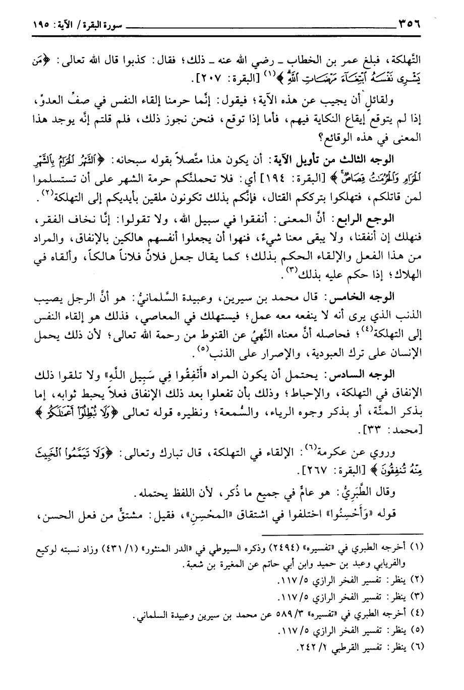 الوجه الرابع: أنَّ المعنى: أنفقوا في سبيل الله، ولا تقولوا: إنَّا نخاف الفقر، فنهلك إن أنفقنا، ولا يبقى معنا شيءٌ، فنهوا أن يجعلوا أنفسهم هالكين بالإنفاق، والمراد من هذا الفعل والإلقاء الحكم بذلك؛ كما يقال جعل فلانٌ فلاناً هلاكاً، وألقاه في الهلاك؛ إذا حكم عليه بذلك.