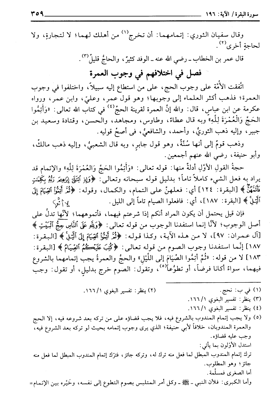 اتَّفقت الأُمَّة على وجوب الحج، على من استطاع إليه سبيلاً، واختلفوا في وجوب العمرة؛ فذهب أكثر العلماء إلى وجوبها؛ وهو قول عمر، وعليّ، وابن عمر، ورواه عكرمة عن ابن عباسٍ، قال: والله إنَّ العمرة لقرينة الحجِّ في كتاب الله تعالى: {وَأَتِمُّواْ الحج والعمرة للَّهِ} وبه قال عطاءٌ، وطاوس، ومجاهد، والحسن، وقتادة وسعيد بن جبير، وإليه ذهب الثوريُّ، وأحمد، والشافعيُّ، في أصحِّ قوليه.