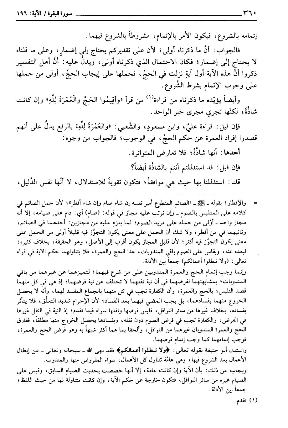 فالجواب: أنَّ ما ذكرناه أولى؛ لأن على تقديركم يحتاج إلى إضمارٍ، وعلى ما قلناه لا يحتاج إلى إضمار؛ فكان الاحتمال الذي ذكرناه أولى، ويدلُّ عليه: أنَّ أهل التفسير ذكروا أنَّ هذه الآية أول آيةٍ نزلت في الحجِّ، فحملها على إيجاب الحجِّ، أولى من حملها على وجوب الإتمام بشرط الشُّروع.