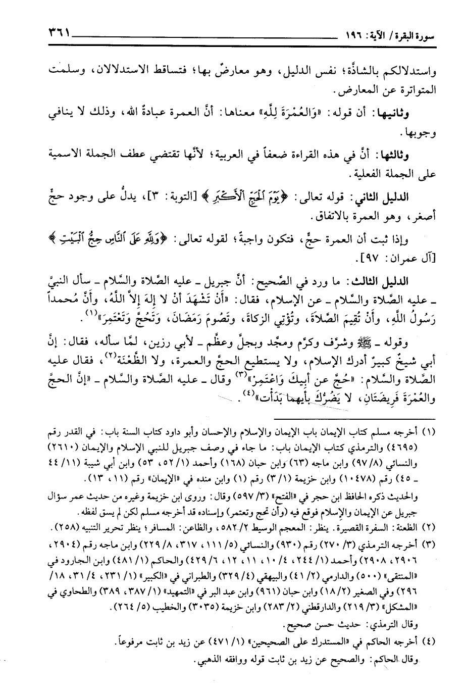 الدليل الثالث: ما ورد في الصَّحيح: أنَّ جبريل - عليه الصَّلاة والسَّلام - سأل النبيَّ - عليه الصَّلاة والسَّلام - عن الإسلام، فقال: «أَنْ تَشْهَدَ أَنْ لا إِلهَ إِلاَّ اللَّهُ، وأَنَّ مُحمداً رَسُولُ اللَّهِ، وأَنْ تٌقِيمَ الصَّلاَةَ، وتُؤْتِي الزكاةَن وتَصُومَ رَمَضَانَ، وَتَحُجَّ وَتَعْتَمِرَ»