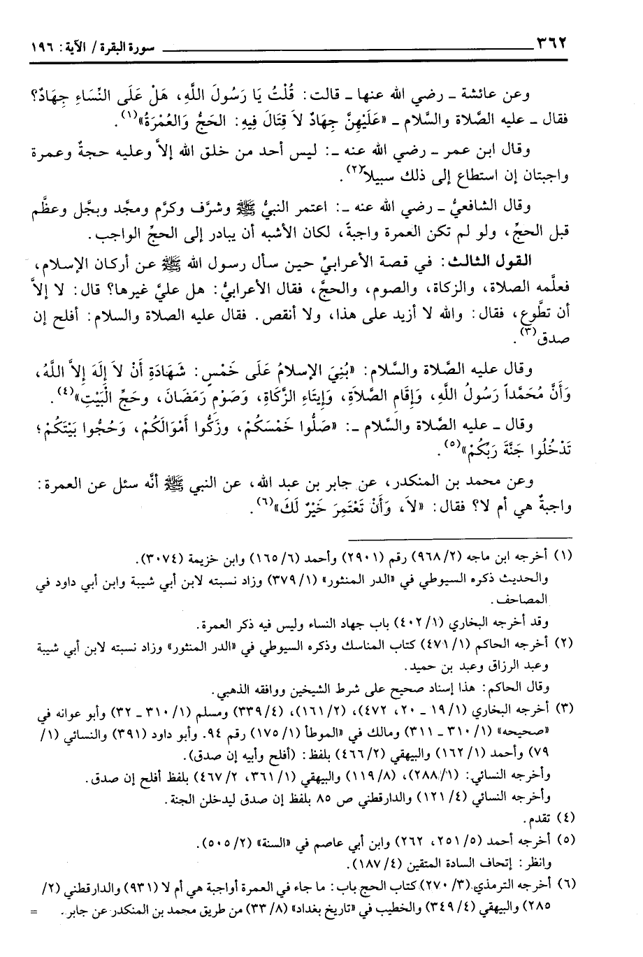 وعن محمد المنكدر، عن جابر بن عبد الله، عن النبي صَلَّى اللَّهُ عَلَيْهِ وَسَلَّم َ أنَّه سئل عن العمرة، واجبةٌ هي أم لا؟ فقال: «لاَ، وَأَنْ تَعْتَمِرَ خَيْرٌ لَكَ»