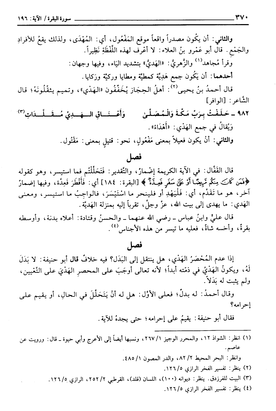 قال القَفَّال: في الآية الكريمة إِضْمَارٌ، والتَّقدير: فَتَحَلَّلْتُم فما استيسر، وهو كقوله {فَمَن كَانَ مِنكُم مَّرِيضاً أَوْ على سَفَرٍ فَعِدَّةٌ} [البقرة: 184] أي: فَأَفْطَرَ فِعِدَّة، وفيها إضمارٌ آخر، هو ما تَقَدَّم، أي: فَلْيَهْدِ أو فلينحر ما اسْتَيْسَرَ، فالواجِبُ ما استيسر، ومعنى الهَدي: ما يهدى إلى بيت الله، عزَّ وجلَّ، تقرباً إليه بمنزلة الهَديَّة.
