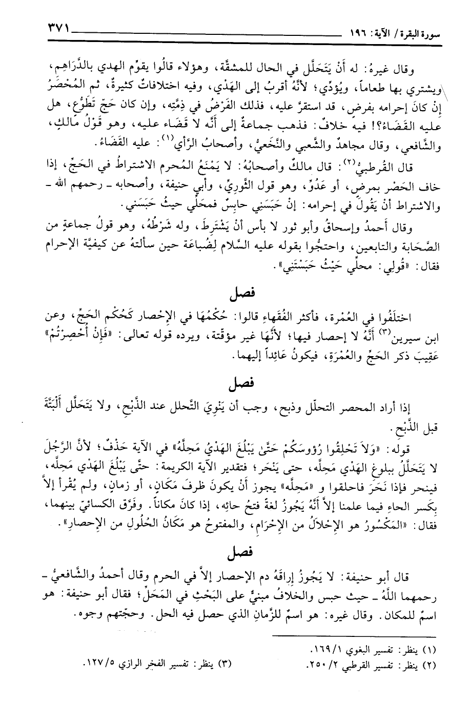 وقال غيرهُ: له أَنْ يَتَحلَّل في الحال للمشقَّة، وهؤلاء قالُوا يقوِّم الهدي بالدَّرَاهِمِ، ويشتري بها طعاماً، ويُؤدِّي؛ لأنَّهُ أقربُ إلى الهَدْي، وفيه اختلافاتٌ كثيرةٌ، ثم المُحْصَرُ إِنْ كانَ إجرامه بفرضٍ، قد استقرَّ عليه، فذلك الفَرْضُ في ذِمَّتِه، وإن كان حَجّ تَطَوُّعٍ، هل عليه القَضَاءُ؟! فيه خلاف: فذهب جماعةٌ إلى أَّنَّه لا قَضَاء عليه، وهو قَوْلُ مالكٍ، والشَّافعي، وقال مجاهدٌ والشَّعبي والنَّخعيُّ، وأصحابُ الرَّأي: عليه القَضَاءُ.