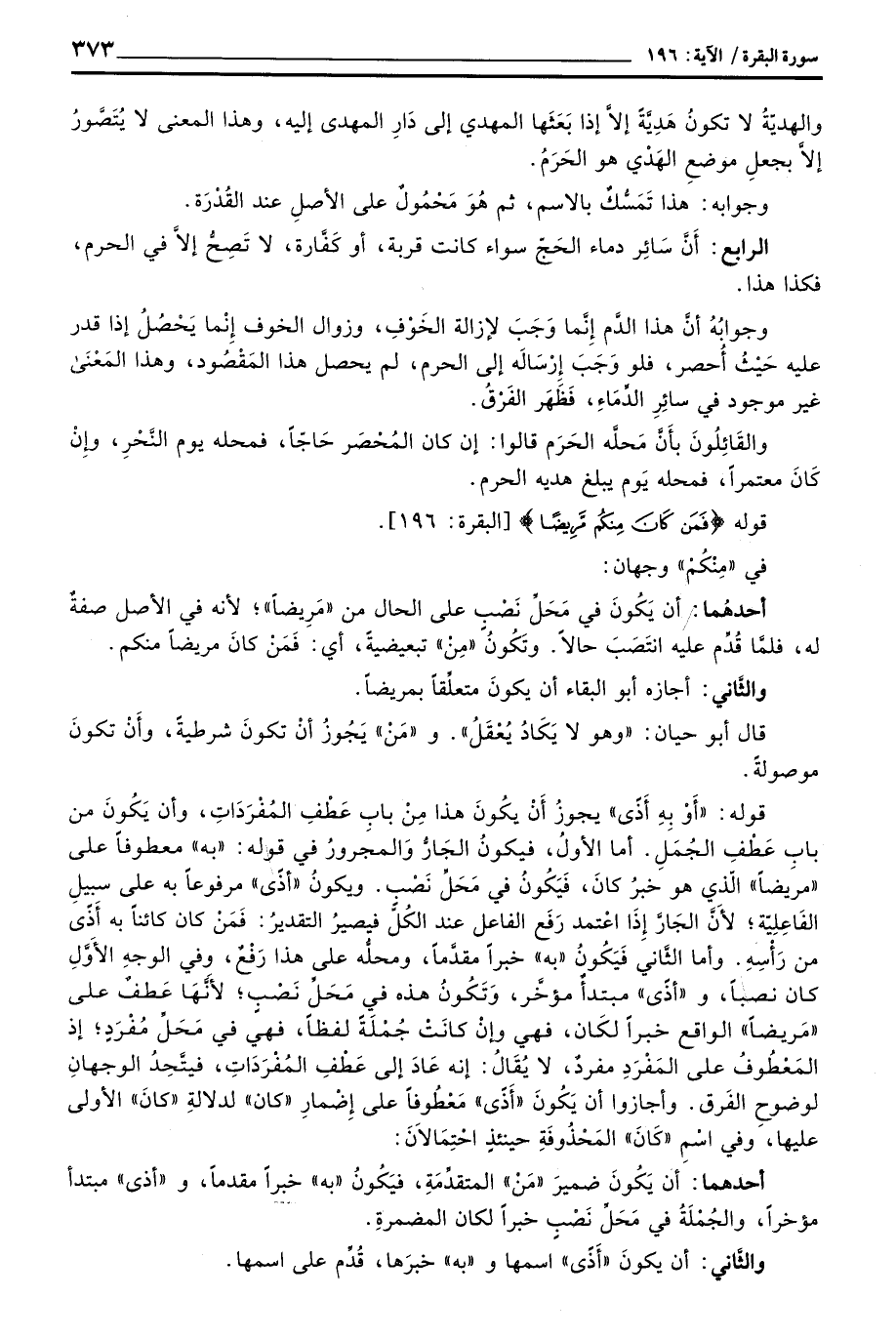 قوله: {أَوْ بِهِ أَذًى} يجوزُ أَنْ يكُونَ هذا مِنْ بابِ عَطْفِ المُفْرَدَاتِ، وأن يَكُونَ من باب عَطْفِ الجُمَلِ. أما الأولُ، فيكونُ الجَارُّ وَالمجرورُ فى قوله: «به» معطوفاً على «مريضاً» الّذي هو خبرُ كانَن فَيَكُونُ فى مَحَلِّ نَصْبٍ. ويكونُ «أذىً» مرفوعاً به على سبيل الفَاعِلِيِّة؛ لأَنَّ إِذَا اعْتمد رَفَع الفاعل عند الكُلَ فيصيرُ التقديرُ: فَمَنْ كان كائناً به أَذىً من رَأْسِهِ. وأما الثاَّاني فَيَكُونُ «به» خبراً مقدَّماً، ومحلُّه على هذا رَفْعٌ، وفى الوجهِ الأَوَّلِ كان نصباً، و «أذىً» مبتدأٌ مؤخَّر، وَتَكُونُ هذه فى مَحَلِّ نَصْبٍ؛ لأنَّها عَطفٌ على «مَريضاً» الواقع خبراً لكَان، فهى وإنْ كانَتْ جُمْلَةً لفظاً، فهي فى مَحَلِّ مُفْرَدٍ؛ إذ المَعْطُوفُ على المَفْرَدِ مفردٌ، لا يُقَالُ: إنه عَادَ إلى عَطْفٍ المُفْرَدَاتِ، فيتَّحِدُ الوجهانِ لوضوحِ الفَرق.