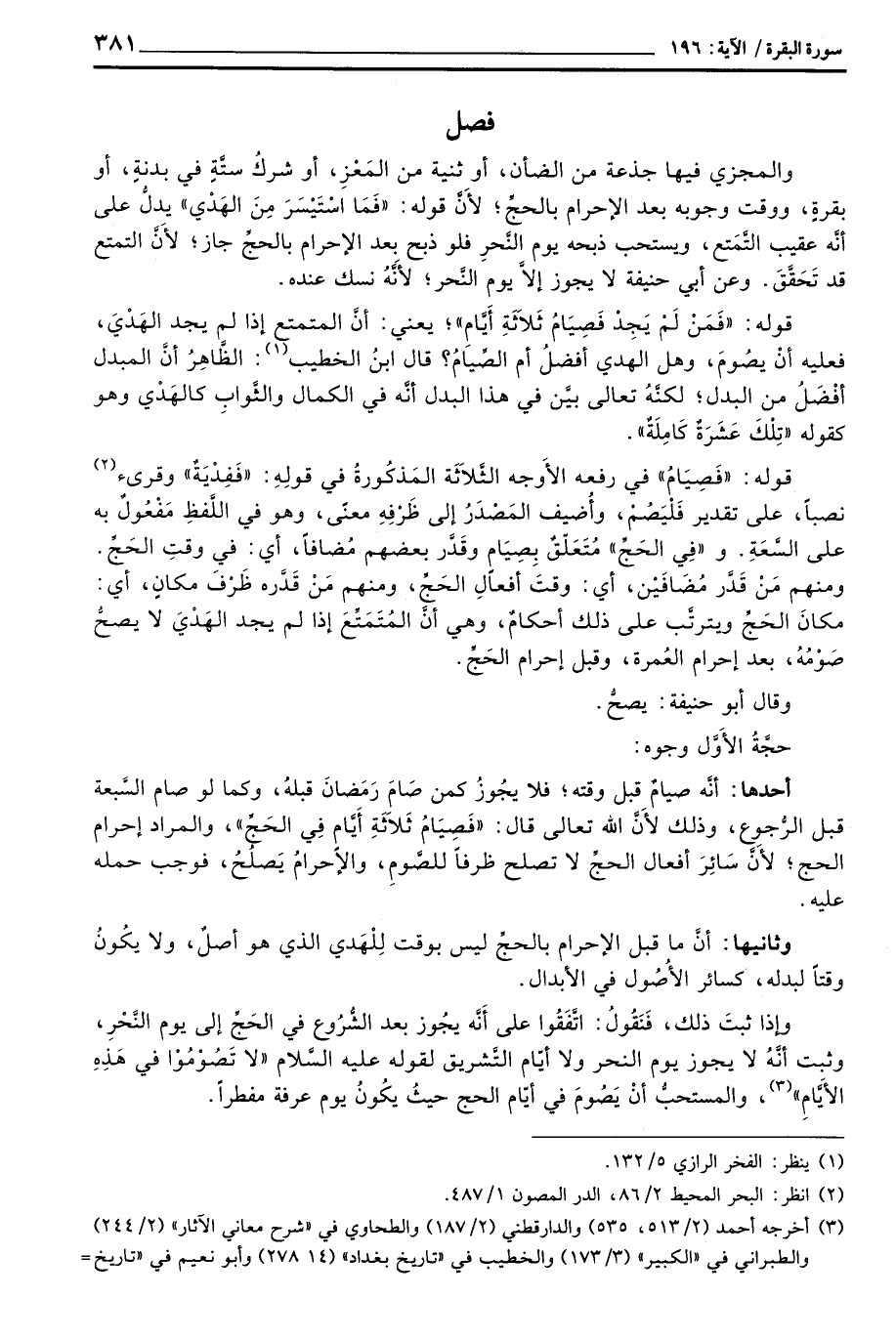 وإذا ثبتَ ذلك، فَنَقُولُ: اتَّفَقُوا على أَنَّه يجُوز بعد الشُّرُوع فى الحَجِّ إلى يوم النَّحْرِ، وثبت أنَّهُ لا يجوز يوم النحر ولا أيّام التَّشريق لقوله عليه السَّلام: «لا تَصُوْمُوْا فى هَذِهِ الأَيَّامِ» ، والمستحبُّ أنْ يَصُومَ فى أيّام الحج حيثُ يكُونُ يوم عرفة مفطراً.