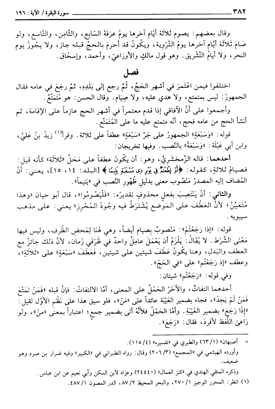 أحدهما التفاتٌ، والآخَرُ الحَمْلُ على المعنى، أمَّا الالتفاتُ: فإنَّ قبله {فَمَنْ تَمَتَّعَ فَمَنْ لَمْ يَجِدْ} ، فجاء بضمير الغَيْبَة عائداً على «مَنْ» ، فلو سيق هذا على نَظْمِ الأَوَّل لقيل: «إِذَا رَجَعَ» بضمير الغَيْبَةِ. وأمَّا الحَمْلُ فلأَنَّهُ أتى بضمير جمعٍ؛ اعتباراً بمعنى «منْ» ، ولو رَاعى اللَّفظ لأفردَ، فقال: «رَجَعَ» .