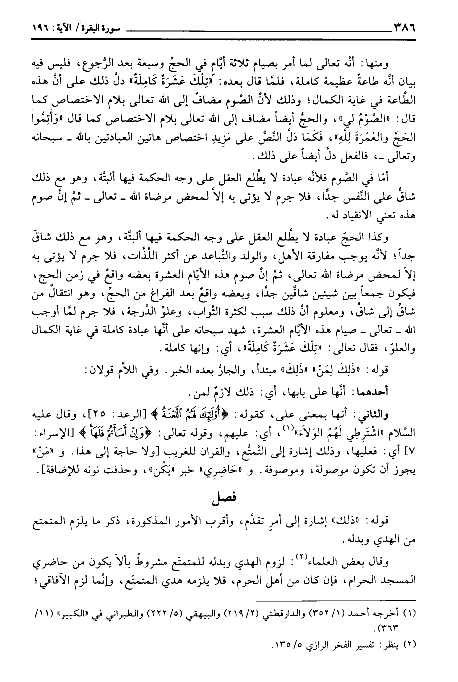 ومنها: أنَّه تعالى لما أمر بصيام ثلاثة أيَّام فى الحجِّ وسبعة بعد الرُّجوع، فليس فيه بيان أنَّه طاعةٌ عظيمة كاملة، فلمَّا قال بعده: {تِلْكَ عَشَرَةٌ كَامِلَةٌ} دلَّ ذلك على أنَّ هذه الطَّاعة فى غاية الكمال؛ وذلك لأنَّ الصَّوم مضافٌ إلى الله تعالى بلام الاختصاص كما قال: «الصَّوْمُ لي» ، والحجُّ أيضاً مضاف إلى الله تعالى بلام الاختصاص كما قال «الصَّوْمُ لي» ، فَكَمَا دَلَّ النَّصُّ على مَزِيدِ اختصاص هاتين العبادتين بالله - سبحانه وتعالى -، فالفعل دلَّ أيضاً على ذلك.