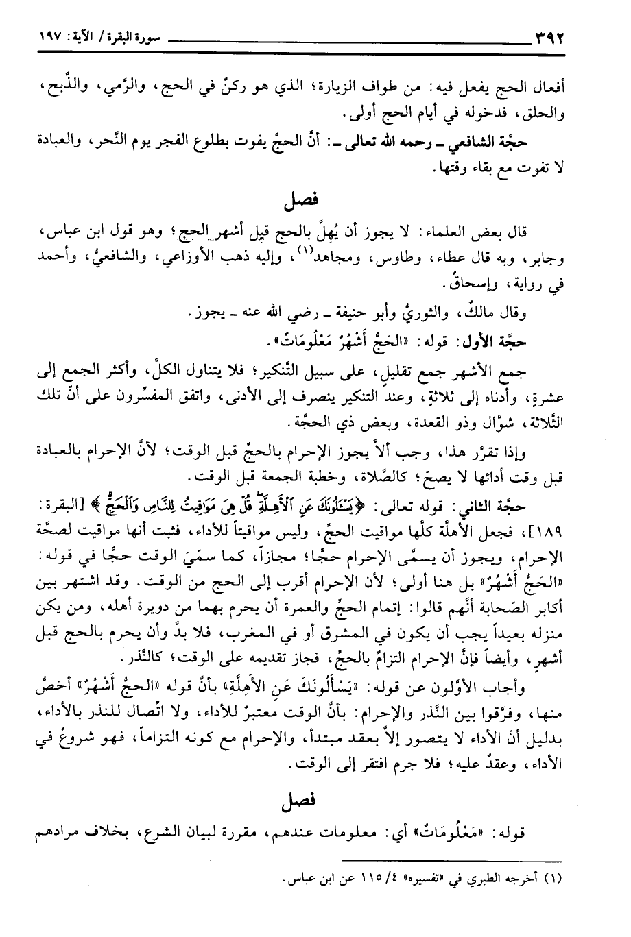 حجَّة الثاني: قوله تعالى: {يَسْأَلُونَكَ عَنِ الأهلة قُلْ هِيَ مَوَاقِيتُ لِلنَّاسِ والحج} [البقرة: 189] ، فجعل الأهلَّة كلَّها مواقيت الحجِّ، وليس مواقيتاً للأداء، فثبت أنها مواقيت لصحَّة الإحرام، ويجوز أن يسمَّى الإحرام حجّاً؛ مجازاً، كما سمّيَ الوقت حجّاً في قوله: «الحَجُّ أَشْهُرٌ» بل هنا أولى؛ لأن الإحرام أقرب إلى الحج من الوقت. وقد اشتهر بين أكابر الصّحابة أنَّهم قالوا: إتمام الحجِّ والعمرة أن يحرم بهما من دويرة أهله، ومن يكن منزله بعيداً يجب أن يكون في المشرق أو في المغرب، فلا بدَّ وأن يحرم بالحج قبل أشهرٍ، وأيضاً فإنَّ الإحرام التزامٌ بالحجِّ، فجاز تقديمه على الوقت؛ كالنَّذر.