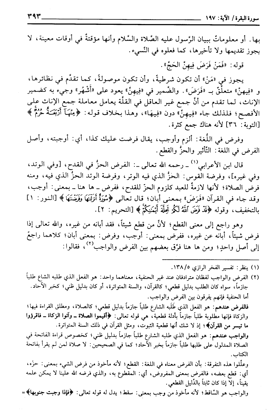 قال ابن الأعرابي - رَحِمَهُ اللَّهُ تعالى -: الفرض الحزُّ في القدح، [وفي الوتد، وفي غيره] ، وفرضة القوس: الحزُّ الذي فيه الوتر، وفرضه الوتد الحزُّ الذي فيه، ومنه فرض الصلاة؛ لأنها لازمةٌ للعبد كلزوم الحزّ لقدح، ففرض ها هنا - بمعنى: أوجب، وقد جاء في القرآن «فَرَضَ» بمعنى أبان؛ قال تعالى: {سُورَةٌ أَنزَلْنَاهَا وَفَرَضْنَاهَا} [النور: 1] بالتخفيف، وقوله: {قَدْ فَرَضَ الله لَكُمْ تَحِلَّةَ أَيْمَانِكُمْ} [التحريم: 2] . راجع إلى معنى القطع؛ لأنَّ من قطع شيئاً، فقد أبانه من غيره، والله تعالى إذا فرض شيئاً، أبانه عن غيره، ففرض بمعنى: أوجب: وفرض: بمعنى أبان؛ كلاهما راجعٌ إلى أصل واحدٍ؛ ومن ها هنا فرَّق بعضهم بين الفرض والواجب، فقالوا: