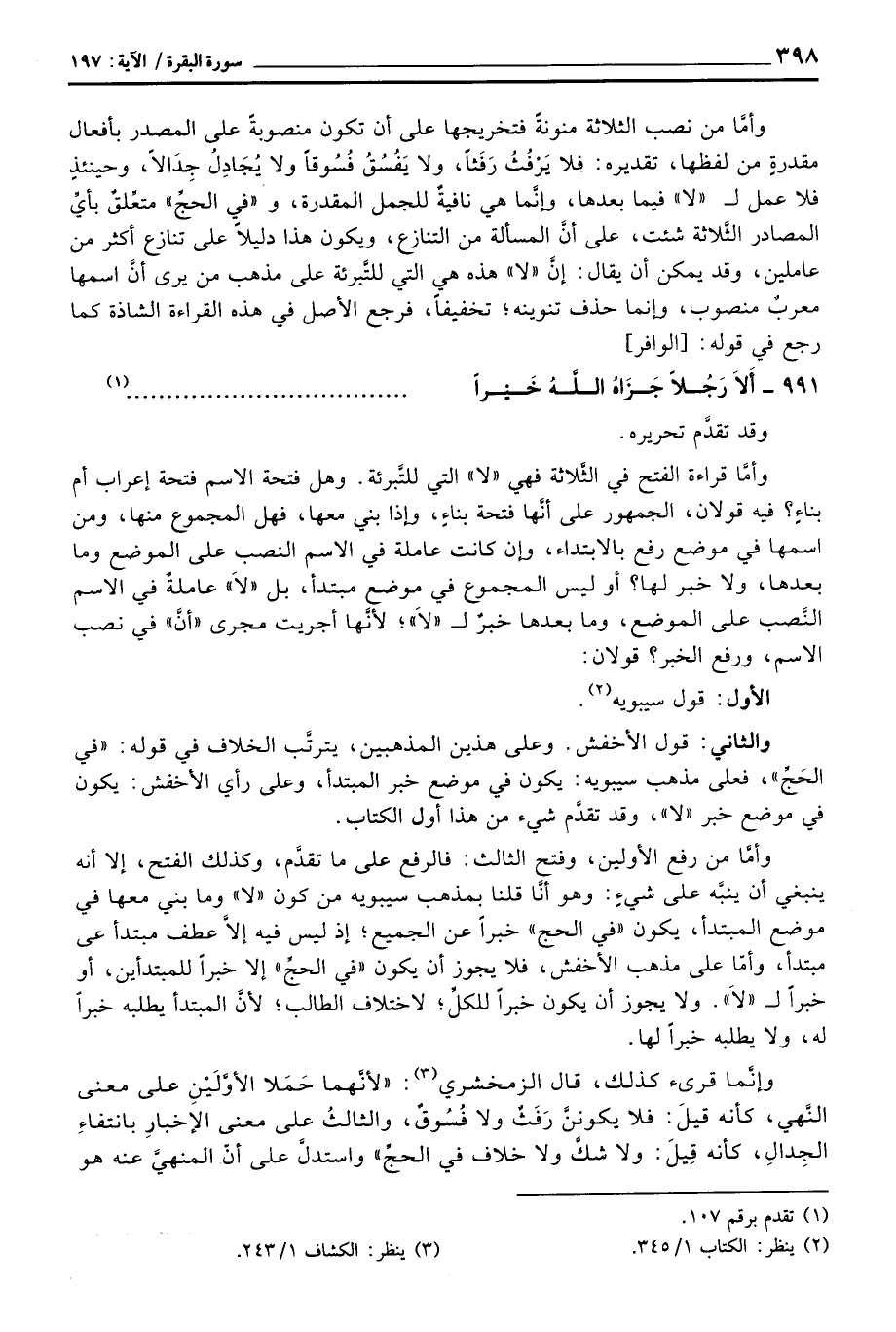 والثاني: قول الأخفش. وعلى هذين المذهبين، يترتَّب الخلاف فى قوله: «فِي الحَجِّ» ، فعلى مذهب سيبويه: يكون فى موضع خبر المبتدأ، وعلى رأي الأخفش: يكون فى موضع خبر «لا» ، وقد تقدَّم شيء من هذا أول الكتاب.