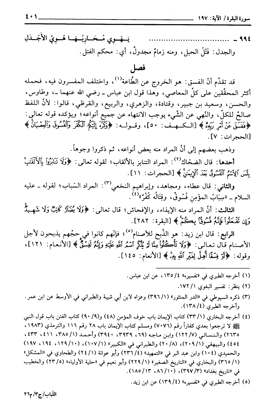 قد تقدَّم أنّ الفسق: هو الخروج عن الطَّاعة، واختلف المفسرون فيه، فحمله أكثر المحقِّقين على كلِّ المعاصي، وهذا قول ابن عباس - رَضِيَ اللَّهُ عَنْهما -، وطاوس، والحسن، وسعيد بن جبير، وقتادة، والزهري، والربيع، والقرظي، قالوا: لأنَّ اللفظ صالحٌ للكلِّ، والنَّهي عن الشَّيء يوجب الانتهاء عن جميع أنواعه؛ ويؤكده قوله تعالى