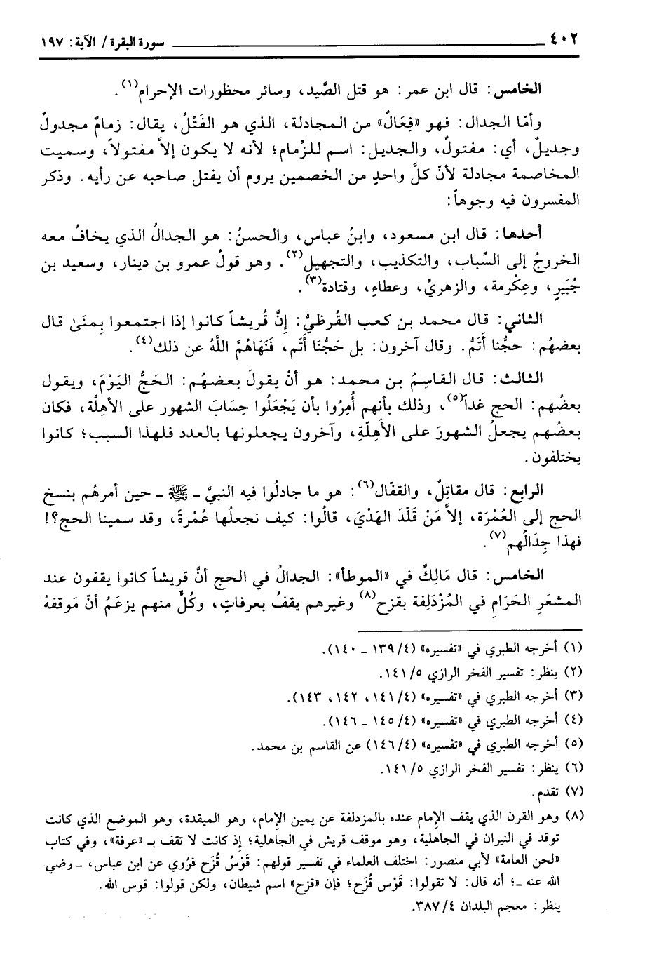 الخامس: قال مَالِكٌ في «الموطأ» : الجدالُ في الحج أنَّ قريشاً كانوا يقفون عن المشعَرِ الحَرَامِ في المُزْدَلِفة بقزح وغيرها يقفُ بعرفاتٍ، وكُلٌّ منهم يزعَمُ أنّ موقفهُ