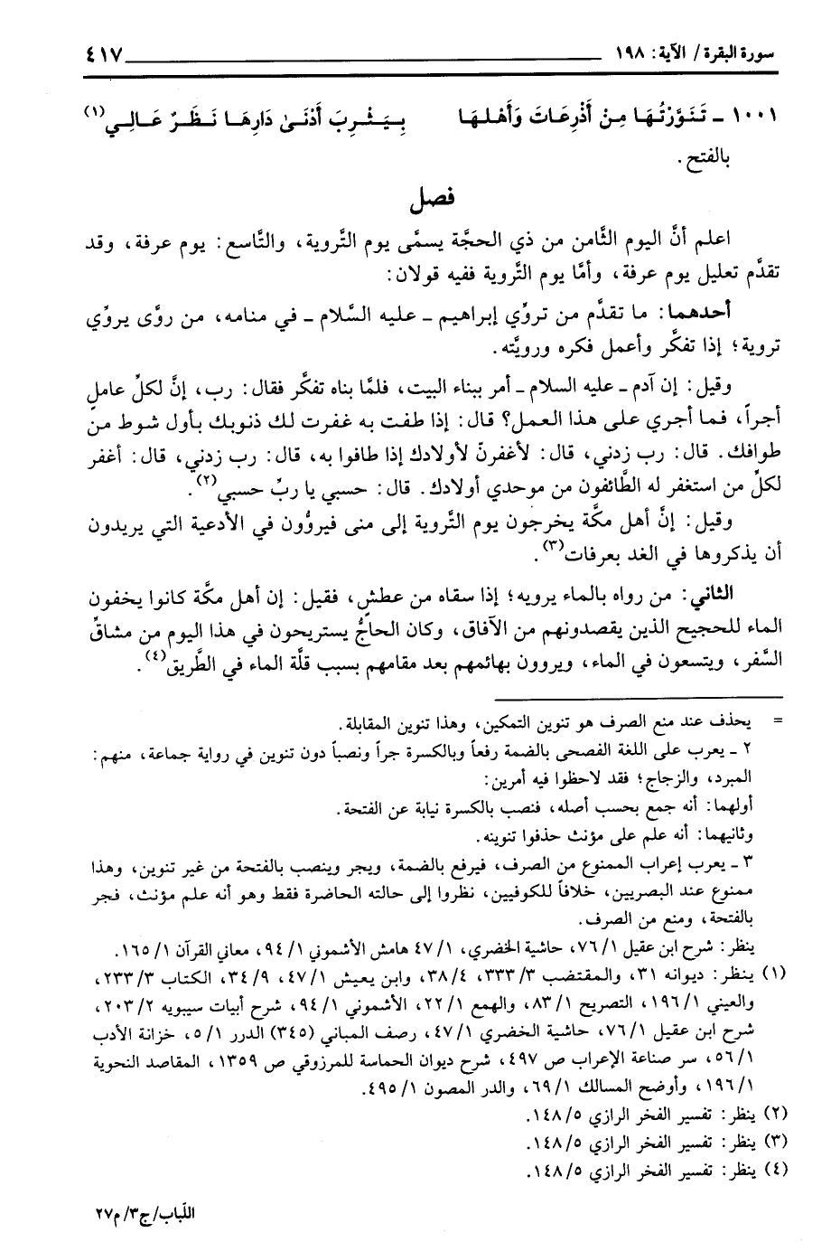 وقيل: إنَّ أهل مَّة يخرجون يوم التَّروية إلى منى فيروُّون في الأدعية التي يريدون أن يذكروها في الغد بعرفات.