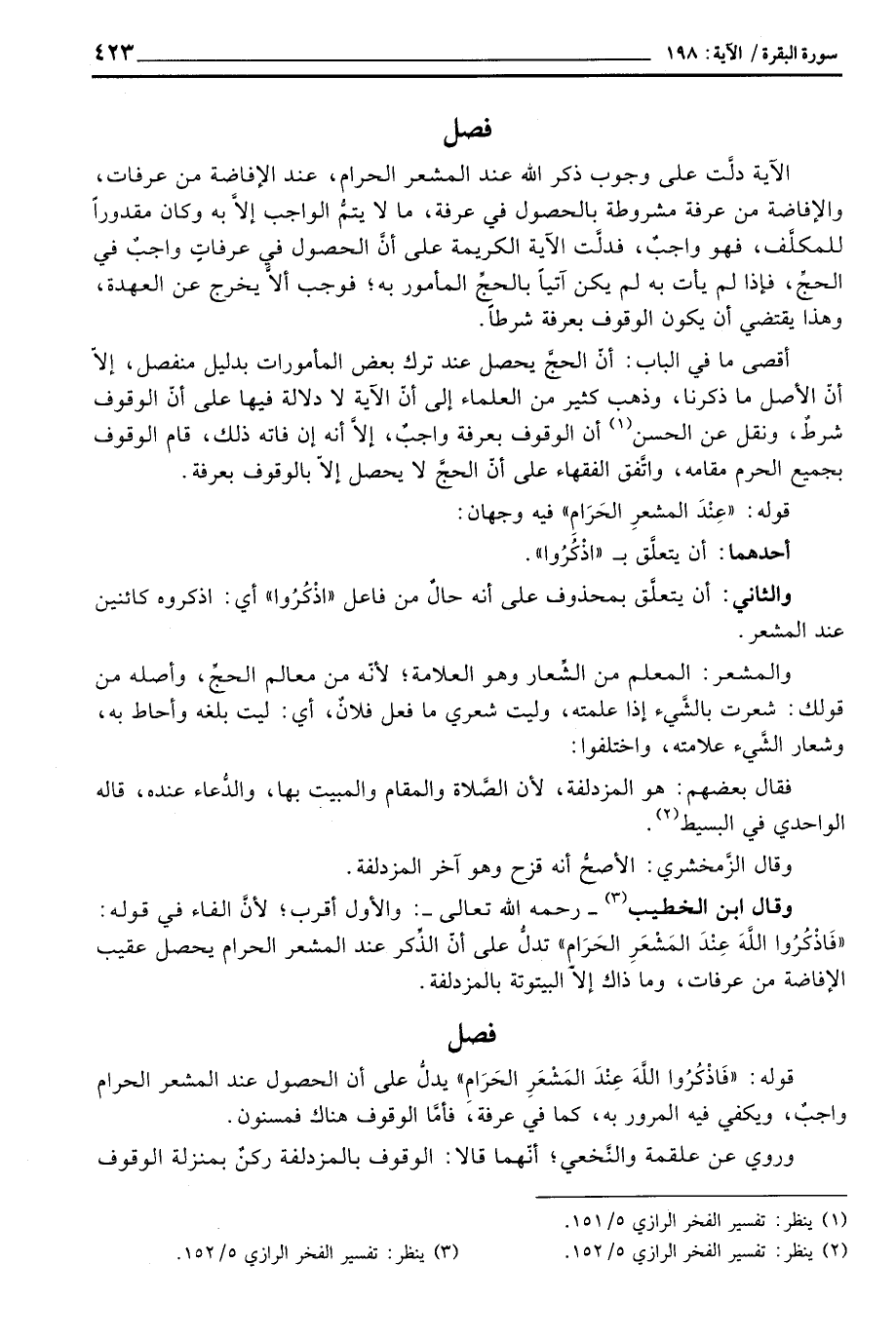 وقال ابن الخطيب - رَحِمَهُ اللَّهُ تعالى -: والأول أقرب؛ لأنَّ الفاء في قوله: {فاذكروا الله عِندَ المشعر الحرام} تدلُّ على أنّ الذِّكر عند المشعر الحرام يحصل عقيب الإفاضة من عرفات، وما ذاك إلاّ البيتوتة بالمزدلفة.