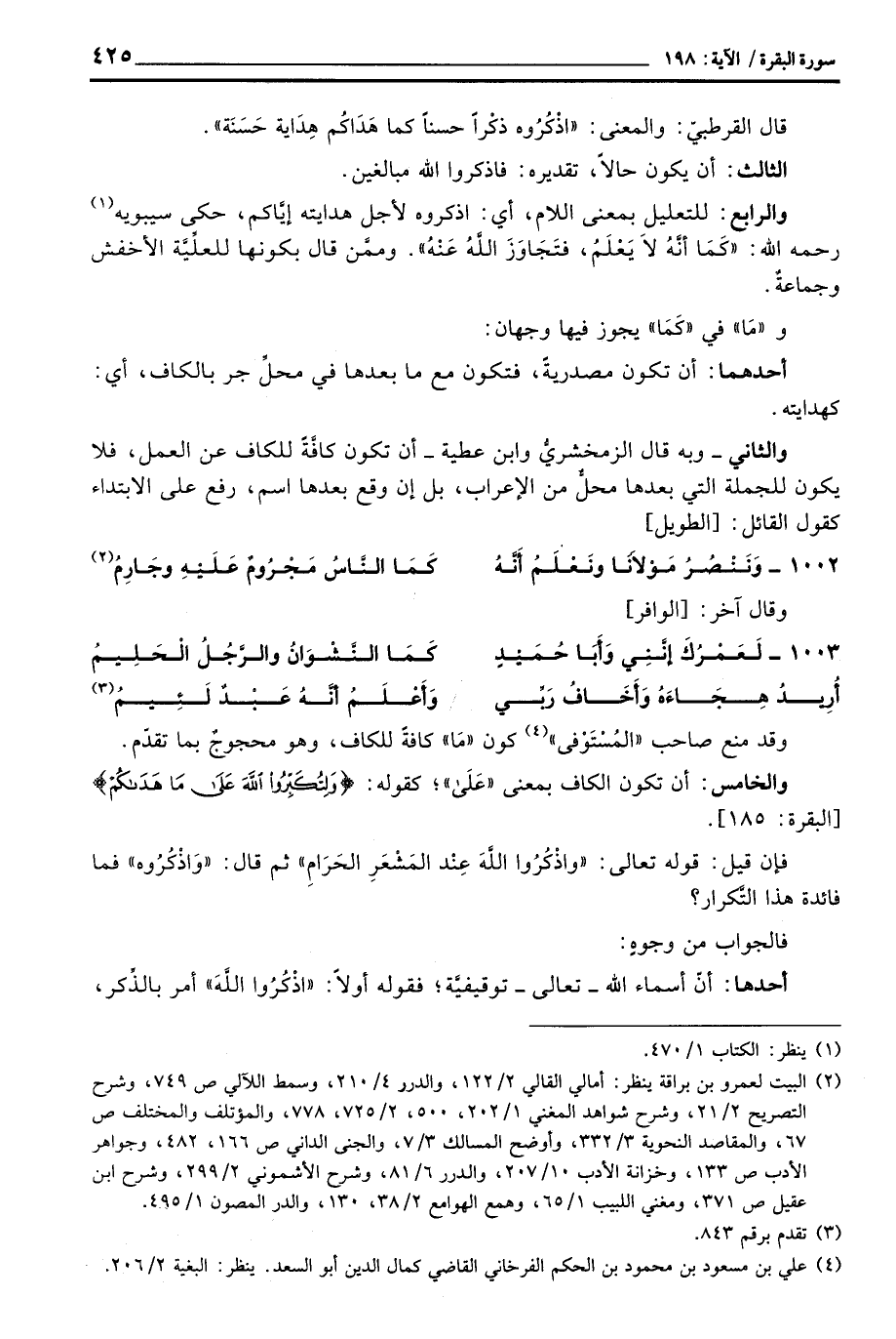 والرابع: للتعليل بمعنى اللام، أي: اذكروه لأجل هدايته إيَّاكم، حكى سيبويه رَحِمَهُ اللَّهُ: «كَمَا أنَّهُ لاَ يَعْلَمُ، فتَجَاوَزَ اللَّهُ عَنْهُ» . وممَّن قال بكونها للعلِّيَّة الأخفش وجماعةٌ.