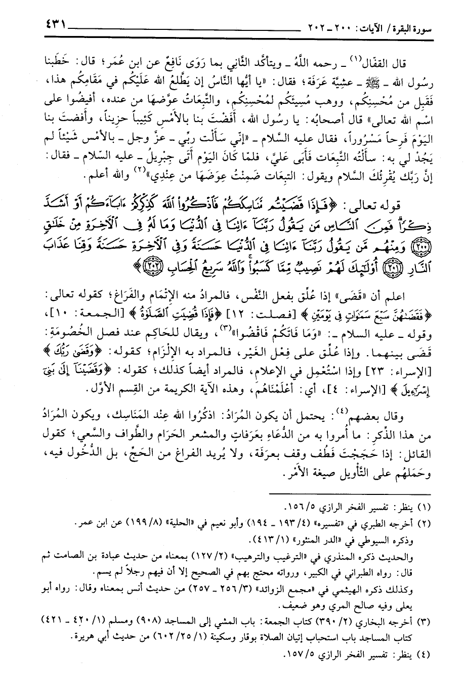 وقال بعضهم: يحتمل أن يكون المُرَادُ: اذكُرُوا الله عِنْد المَنَاسِك، ويكون المُرَادُ من هذا الذَّكرِ: ما أُمروا به من الدُّعَاءِ بعَرَفاتٍ والمشعر الحَرَام والطَّواف والسَّعي؛ كقول القائل: إذا حَجَجْتَ فَطُف وقف بعرَفَة، ولا يُريد الفراغ من الحَجِّ، بل الدُّخُول فيه، وحَمَلهُم التَّأْويل صيغة الأَمر.