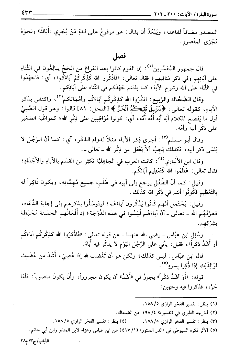 قال جمهور المُفسِّرين: إن القوم كانوا بعد الفراغ من الحَجِّ يبالِغُوا في الثَّنَاءِ على آبَائِهِم وفي ذكر مَناقِبهم، فقال تعالى: {فاذكروا الله كَذِكْرِكُمْ آبَآءَكُمْ} ، أي: فاجهَدُوا في الثَّنَاء على الله وشرح الآية، كما بذلتم جَهْدَكم في الثَّناء على آبَائِكم.